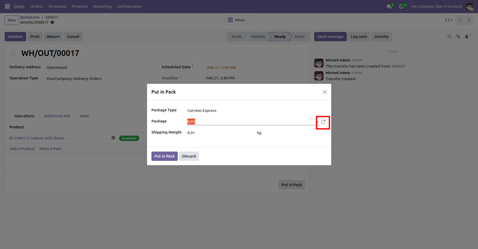 In the delivery order, click "Put In Pack".