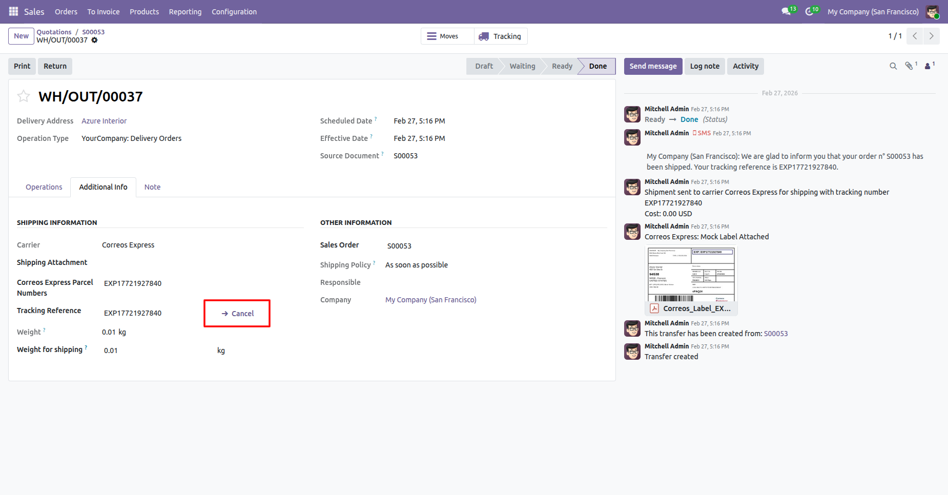 The delivery order with details. It displays the Shipping Information under the Additional Info tab after generating the label.