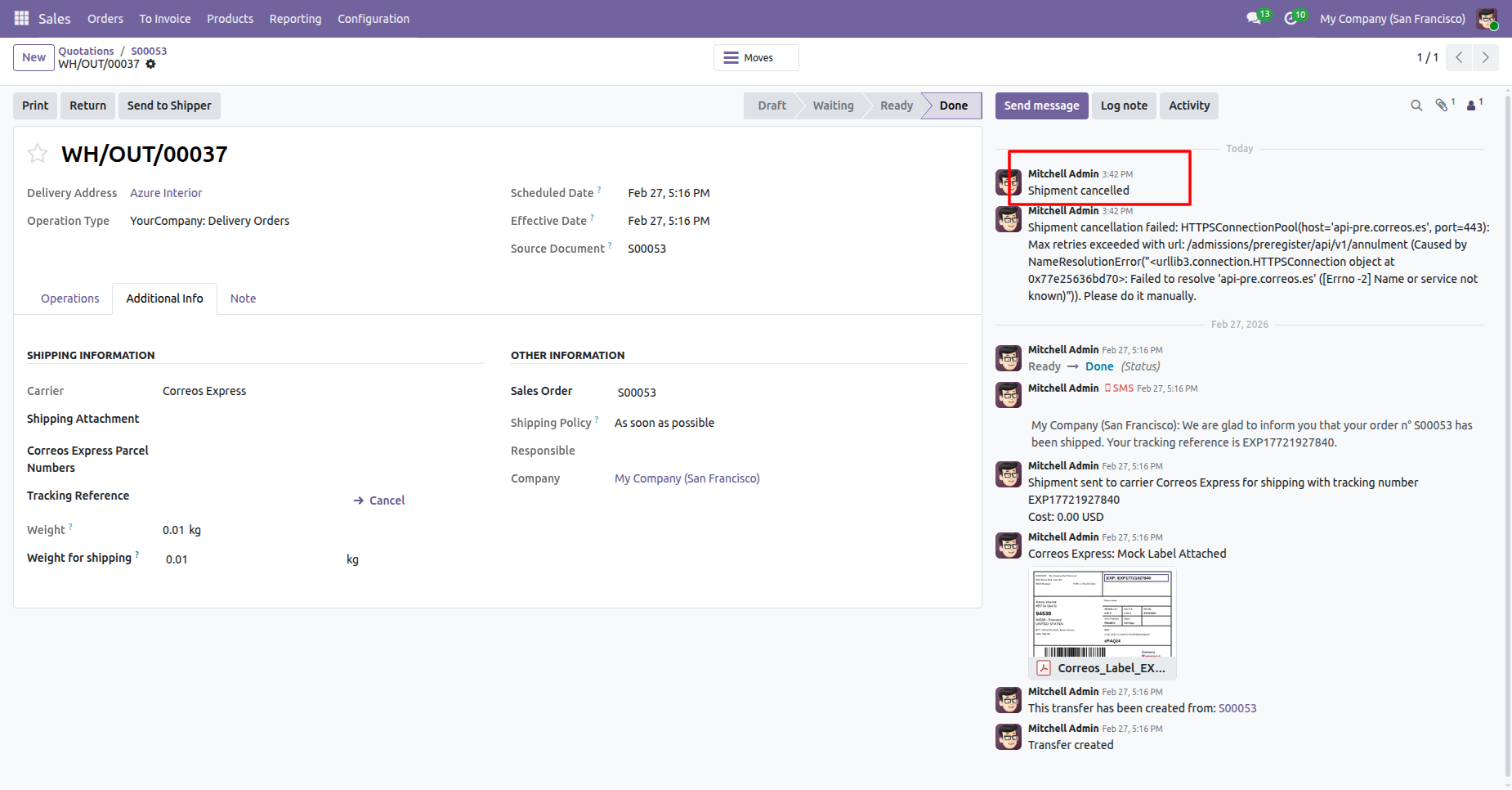 Shipment cancelled with a chatter message.