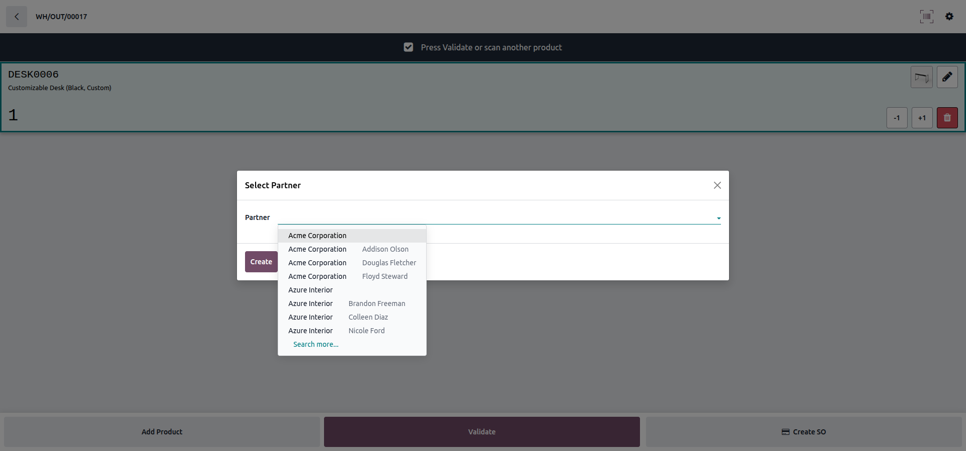 Clicking 'Create' to confirm the selected customer.