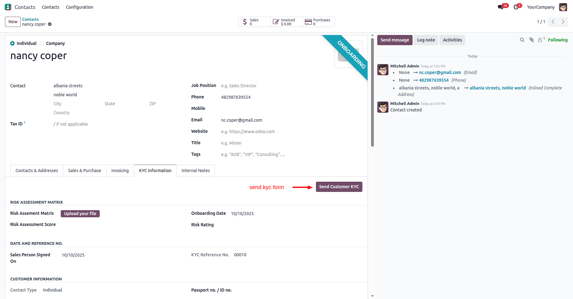Add KYC details to the contact, and click on the "Send Customer KYC" button.