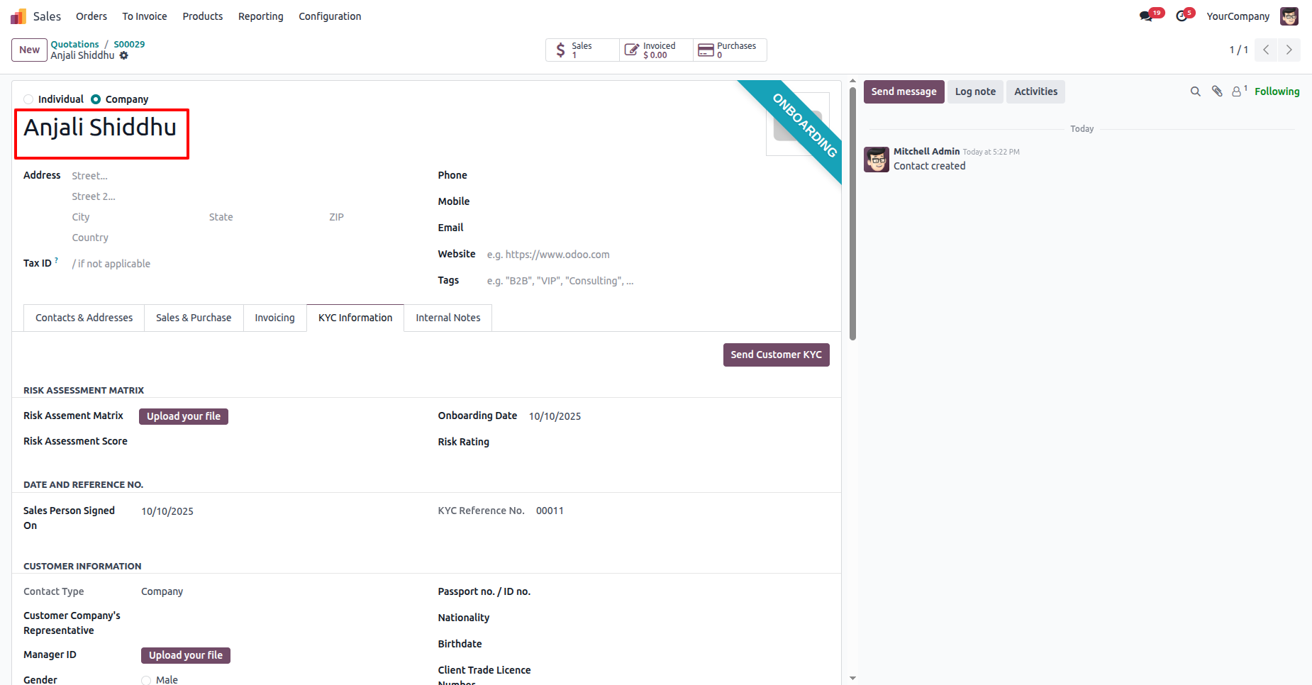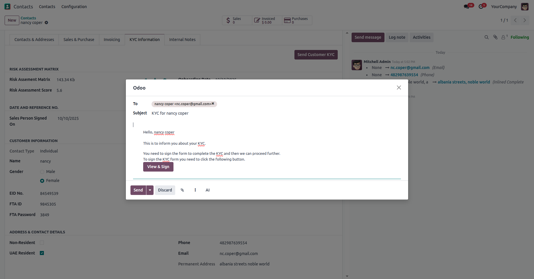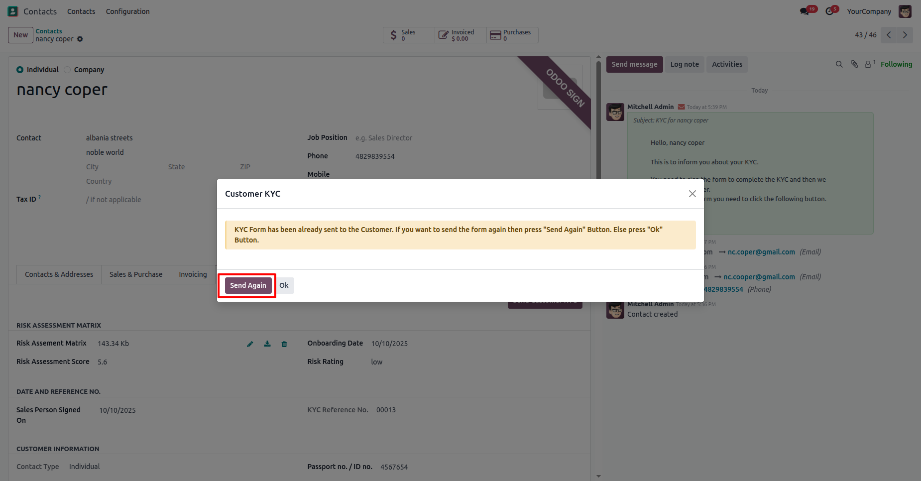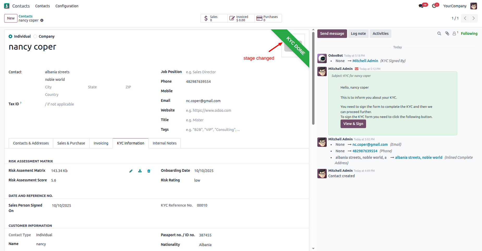 Here, you can see that the stage changes to "Odoo Sign" after sending the KYC form.