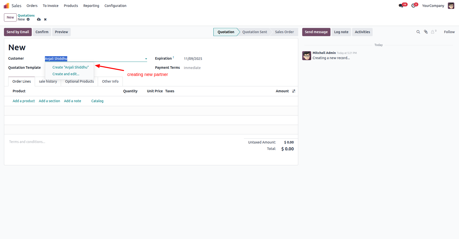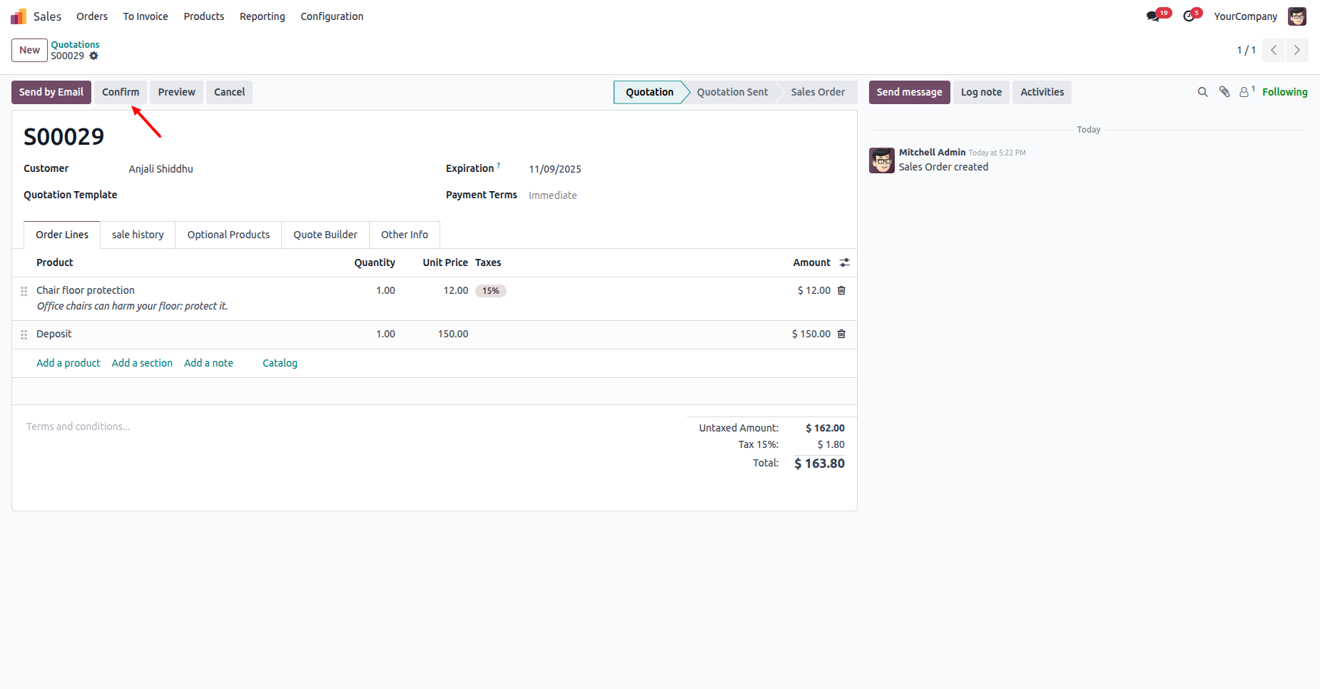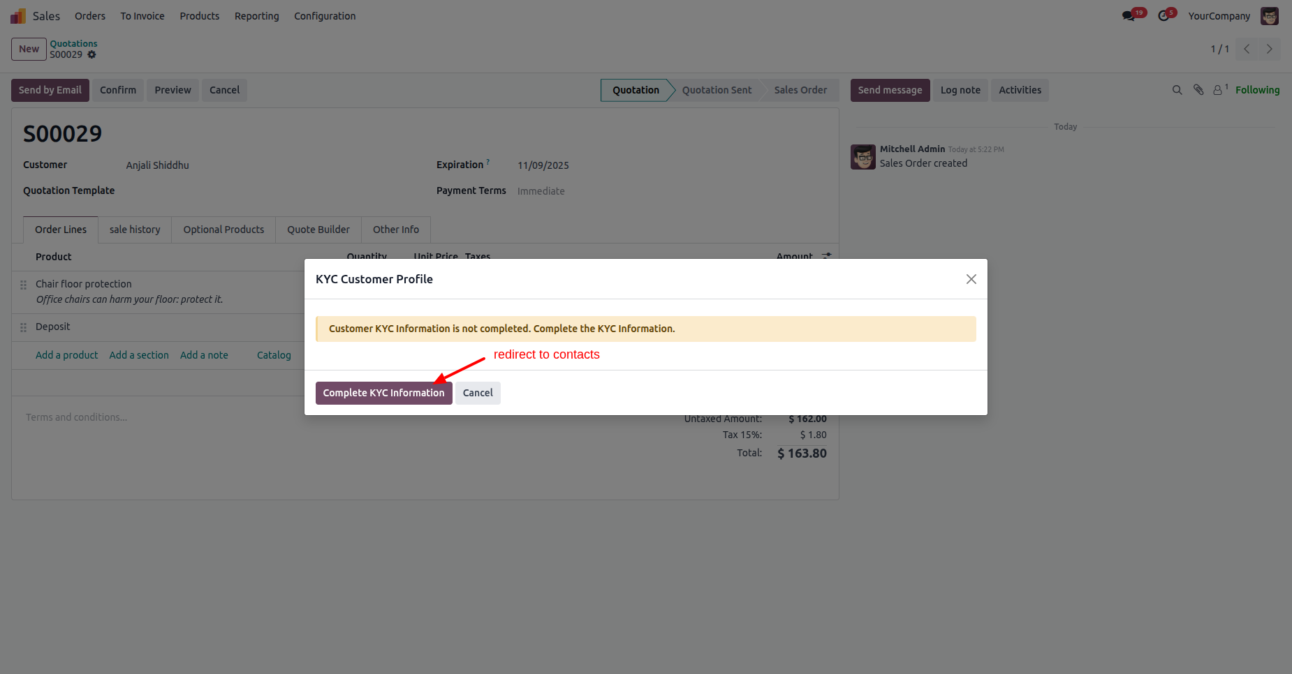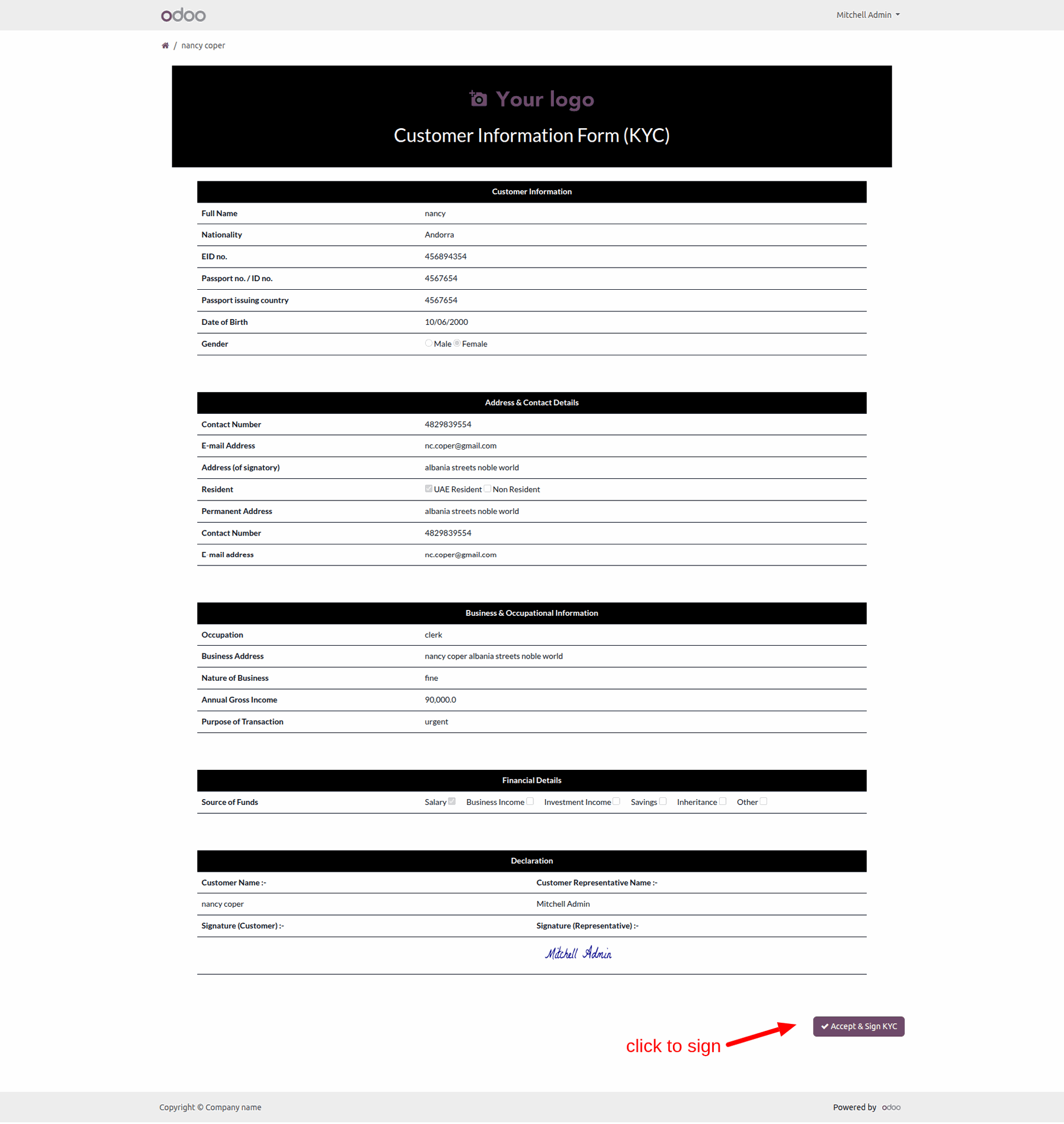 Here, you can see that the stage changes to "Odoo Sign" after sending the KYC form.