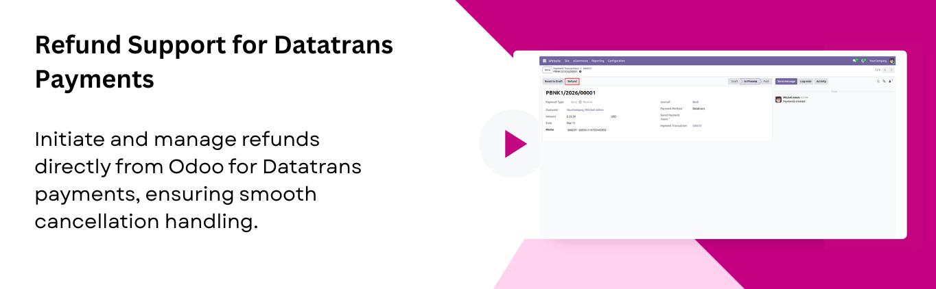 Process refunds directly from Odoo for any order paid through Datatrans. Ensuring smooth handling of cancellations.