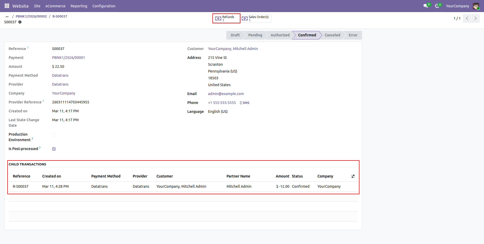 Payment transactions form view with refund details.