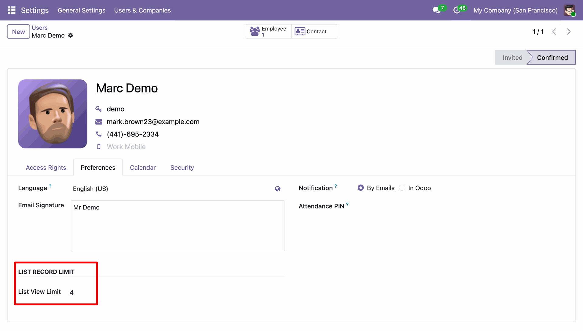 The user sets the List View Limit to 4 within the highlighted LIST RECORD LIMIT section of the Preferences tab.