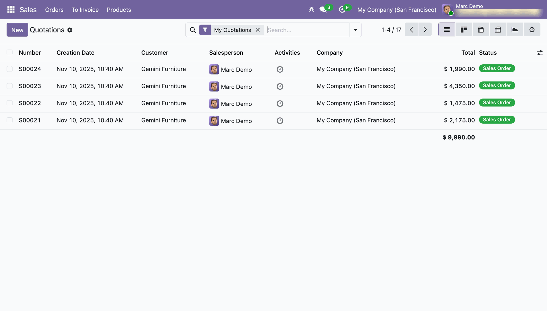 The system displays the Quotations list with the pagination explicitly showing 1-4 / 17, confirming that the previously configured limit of 4 records per page is active.