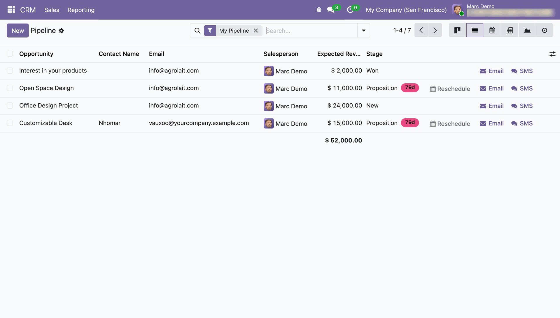 The user checks the CRM Pipeline list, where the pagination 1-4 / 7 confirms that the List View Limit of 4 is consistently enforced.