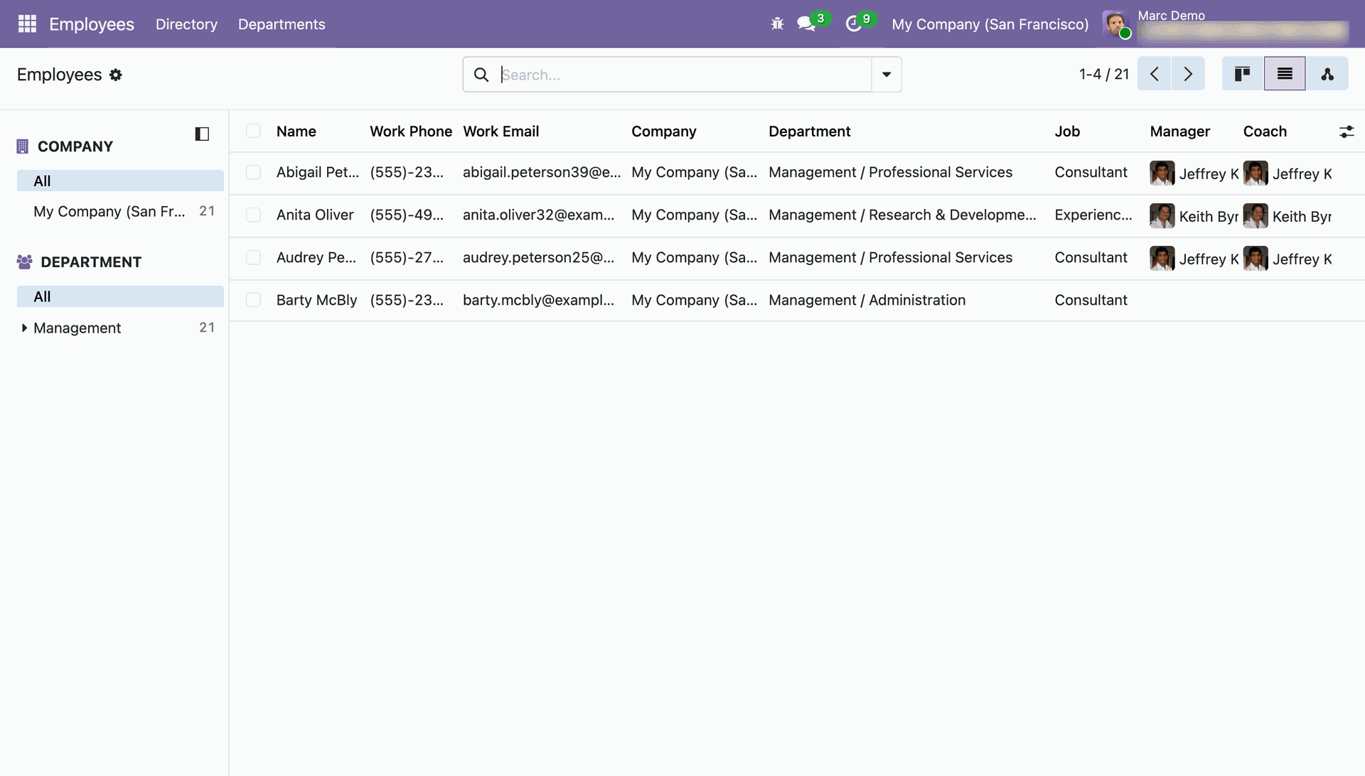 The user views the Employees list, where the pagination 1-4 / 21 confirms that the List View Limit of 4 is also enforced in the employee directory.