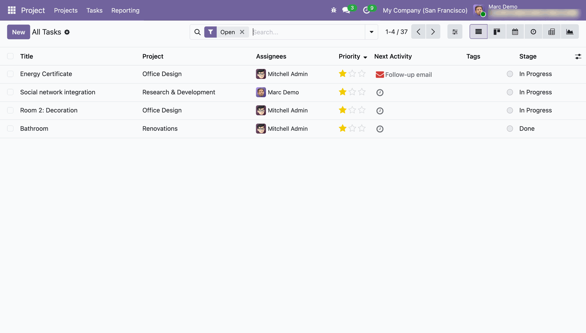 The user views the All Tasks list, where the pagination 1-4 / 37 further confirms the enforcement of the List View Limit of 4.
