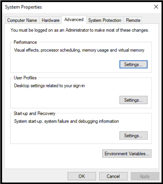 14. Click on the advanced tab. Then click on the “Environment Variables …” below