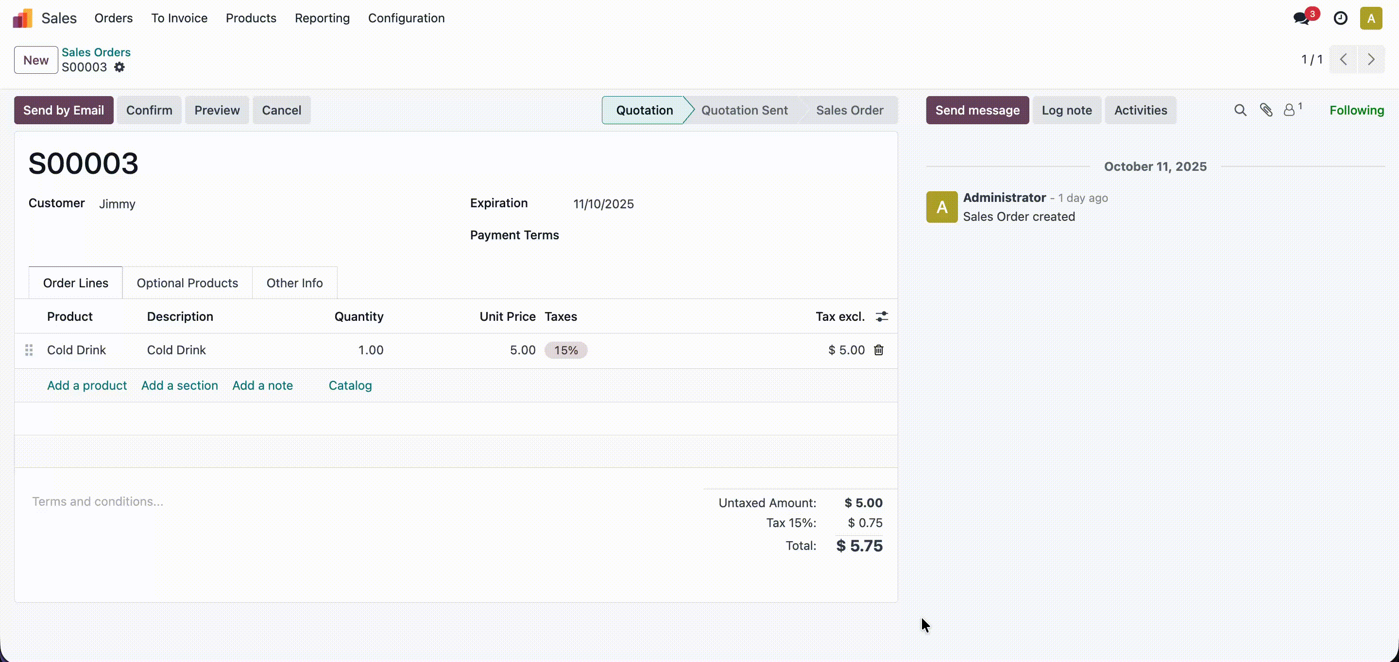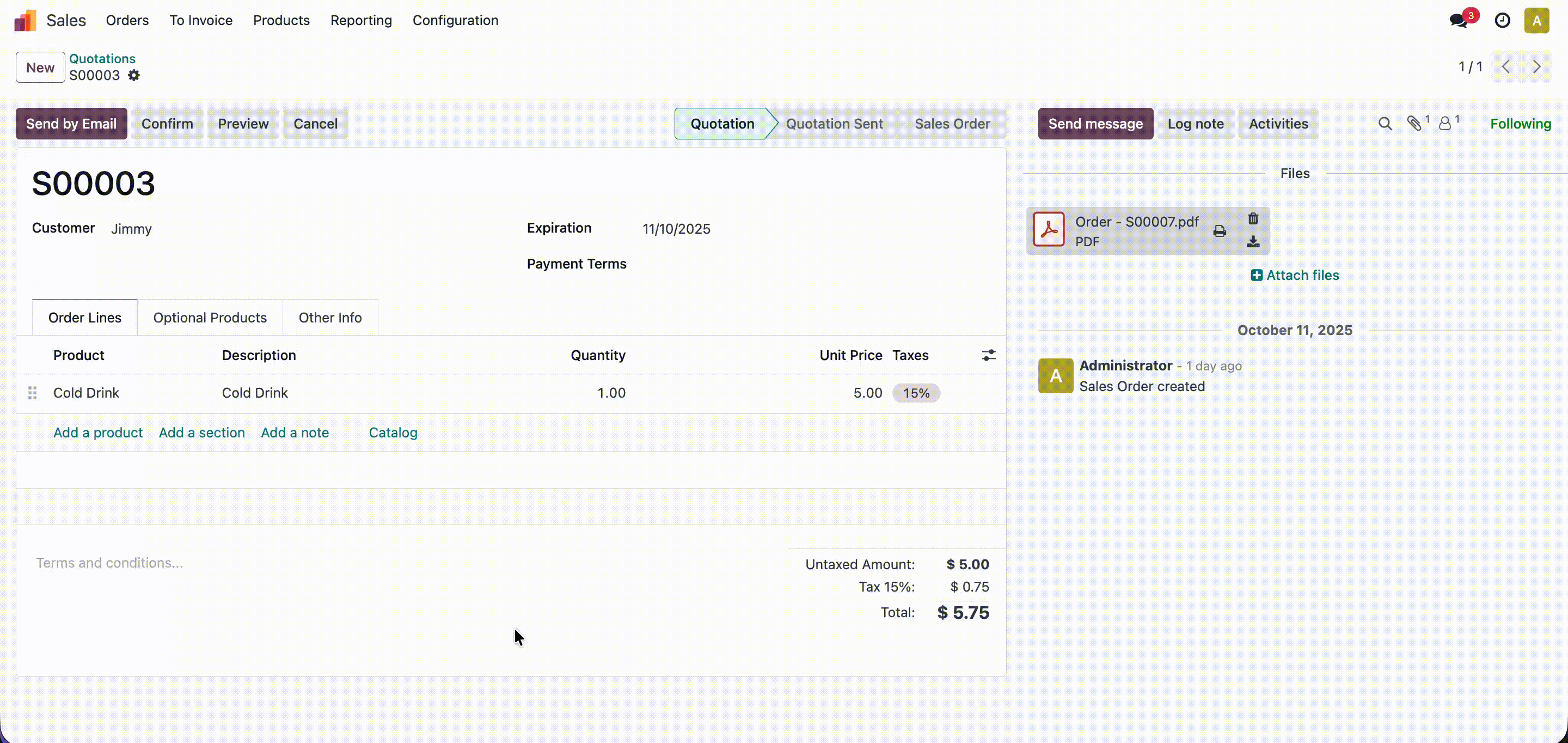 Here, you can see the generated PDF in the chatter, and when you hover your cursor over it, the “Send to Printer” will appear.