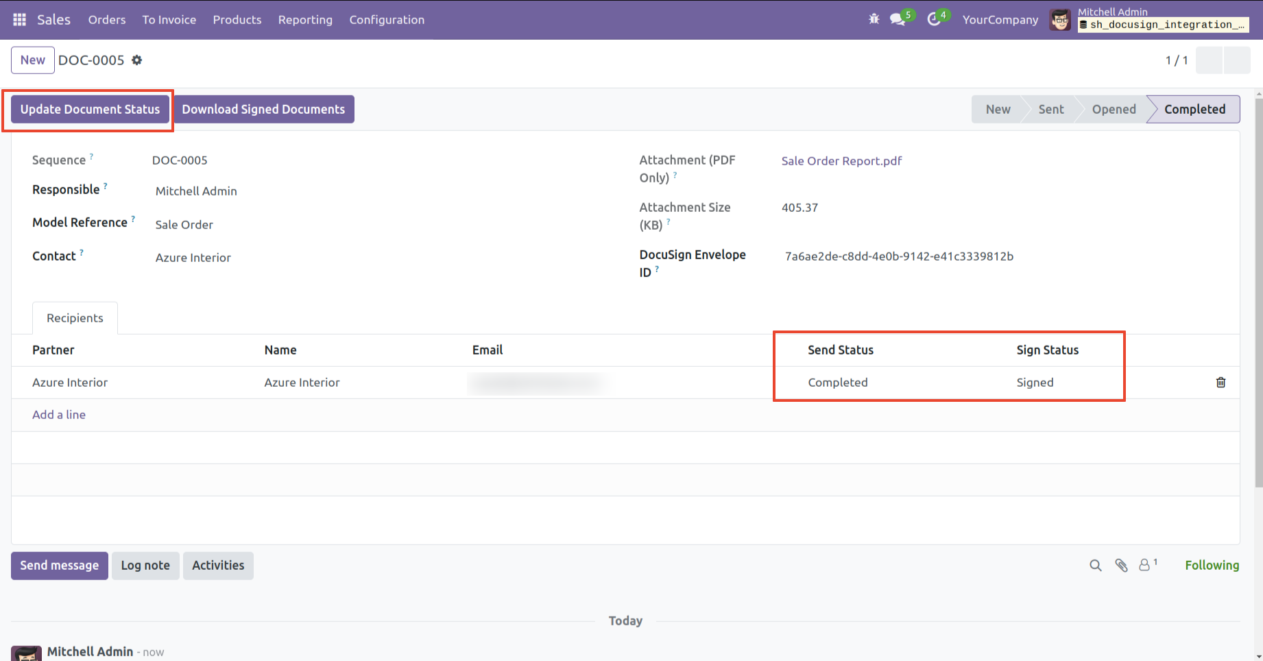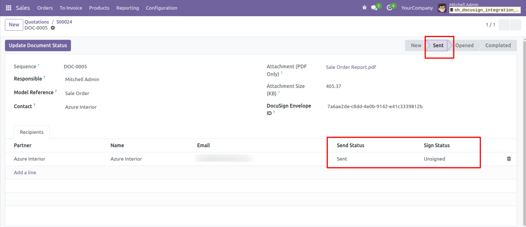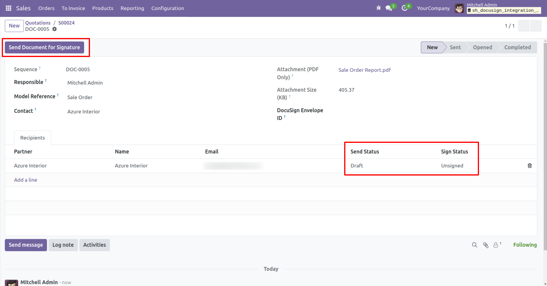 - You can send documents directly to partners from Odoo for signing via DocuSign.