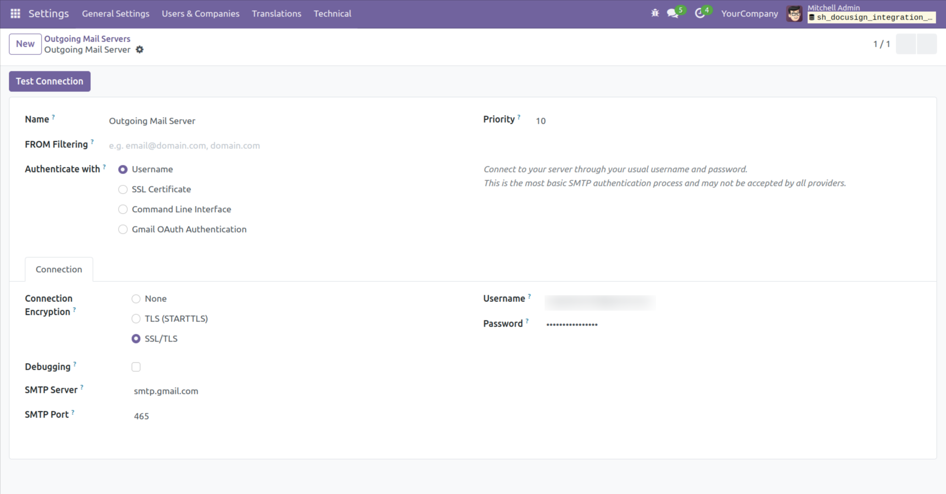 Form view of the 'Outgoing Mail Servers'.