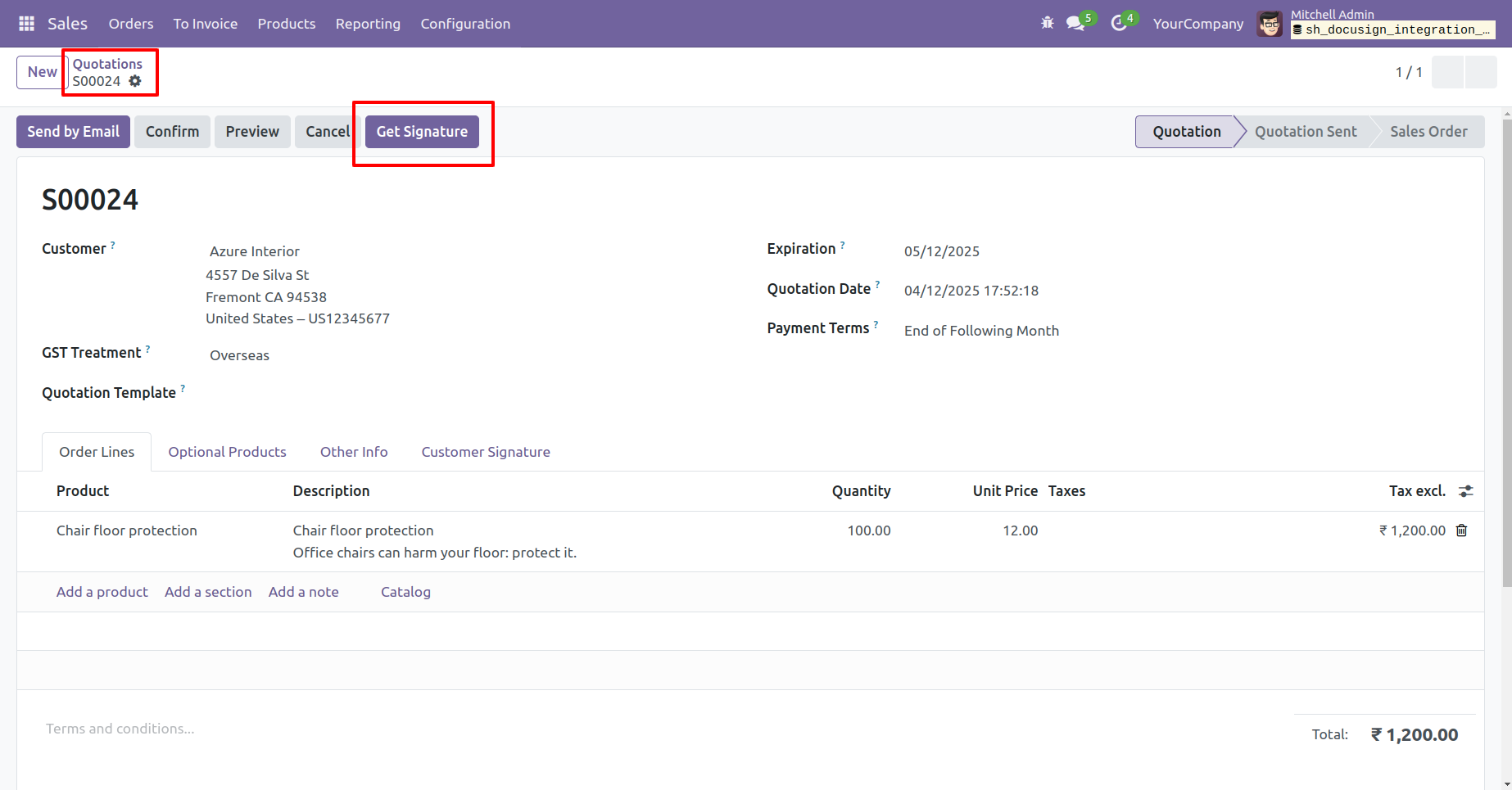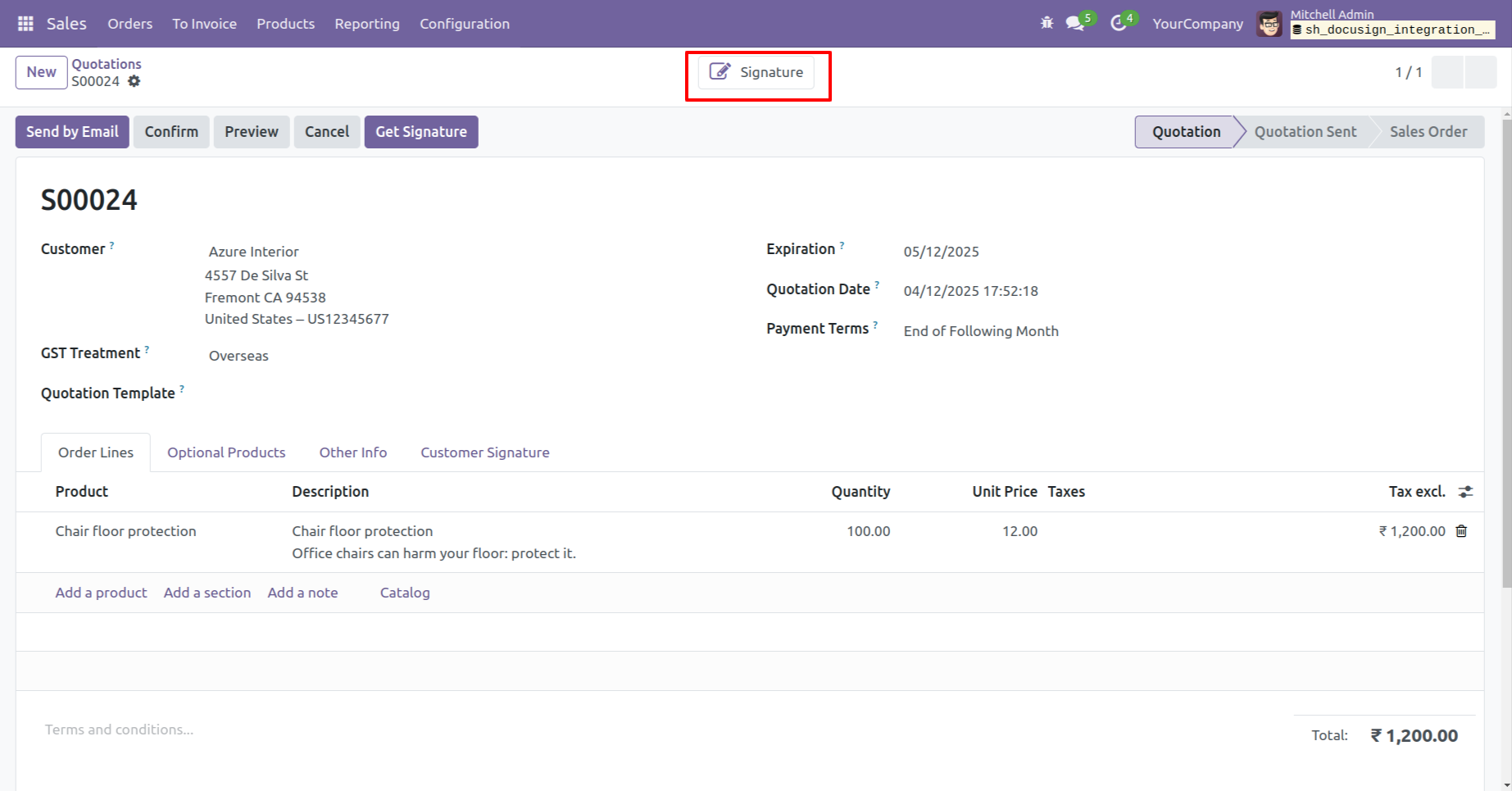 Create a quotation and then click on the "Get Signature" button.
