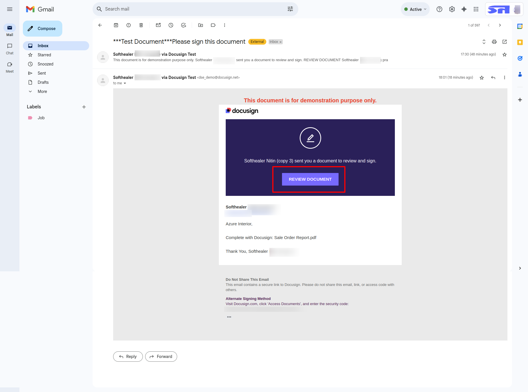 In the email, click on the "Review Document" to open and view the signature document.