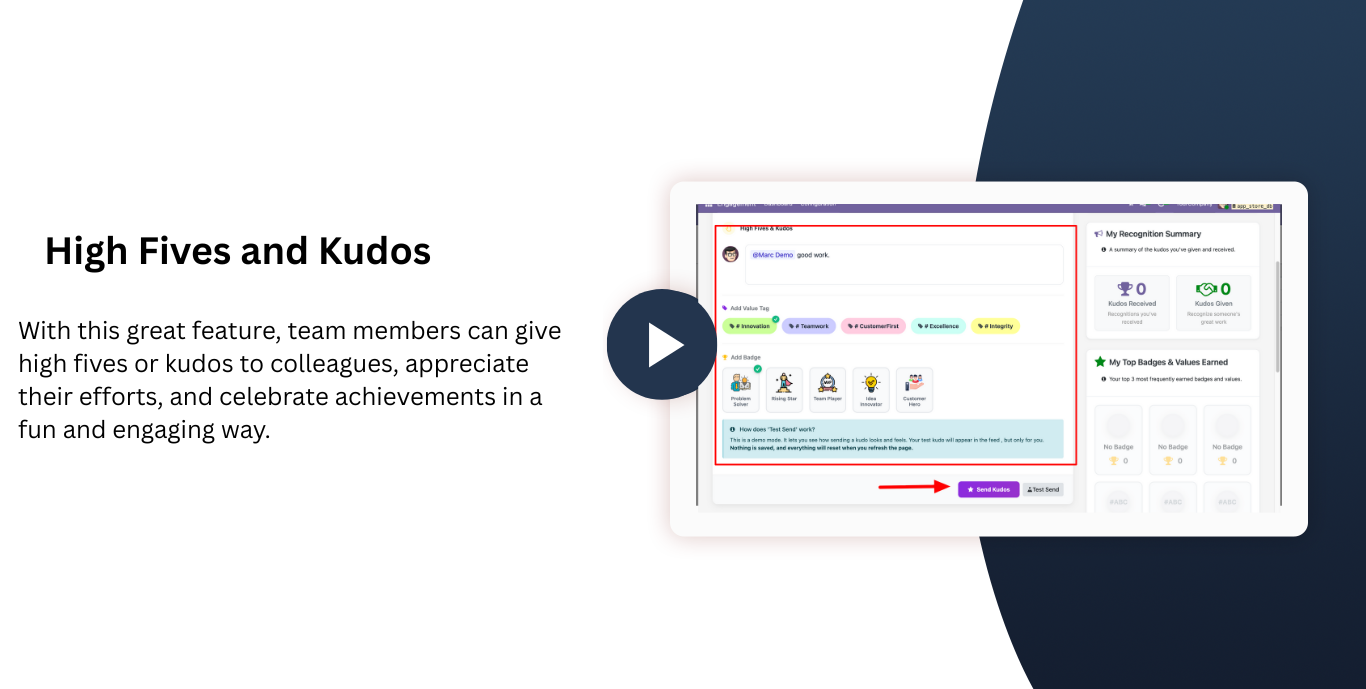 To give someone a high five, type '@' to select their name, write your kudos, and then click on the 'Send Kudos' button.