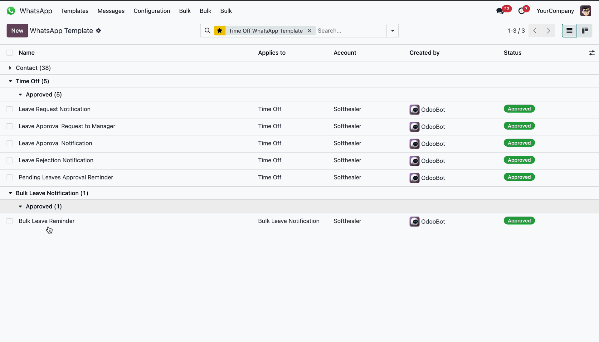 Overview of WhatsApp templates for Time Off and Bulk Leave notifications.