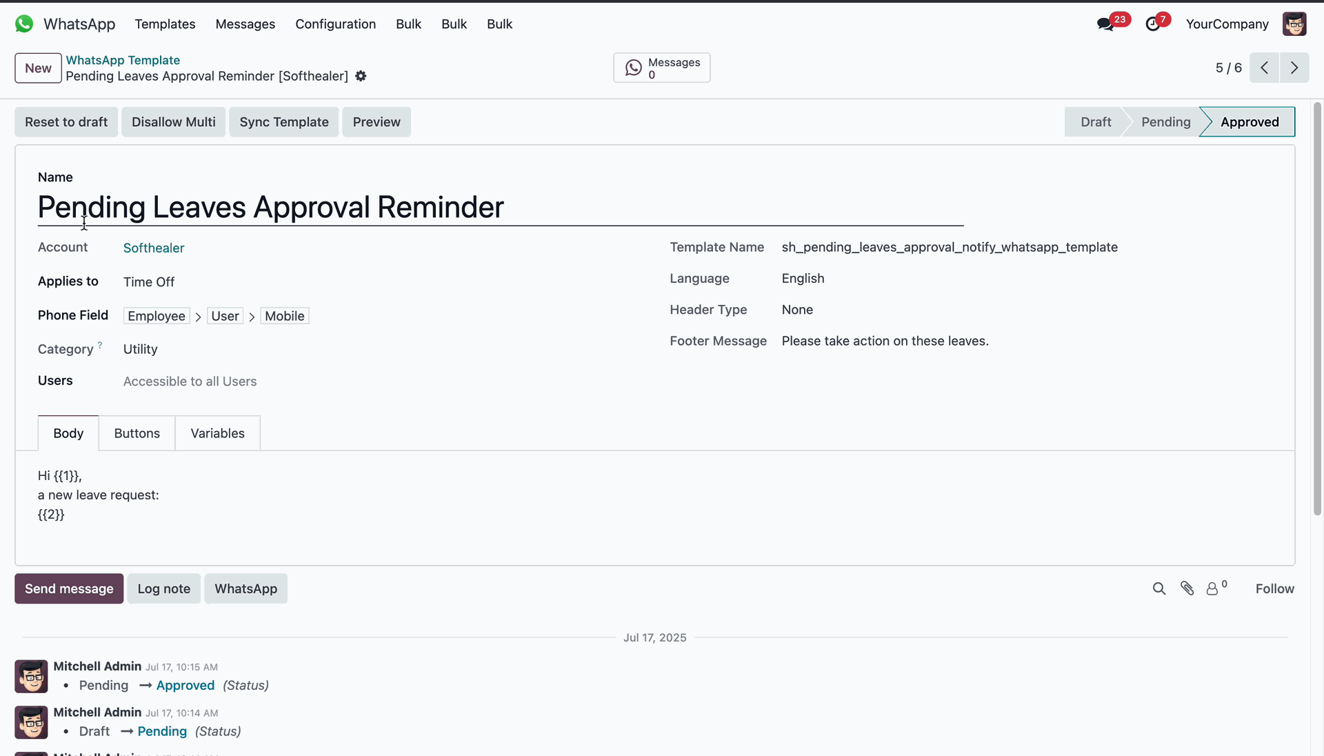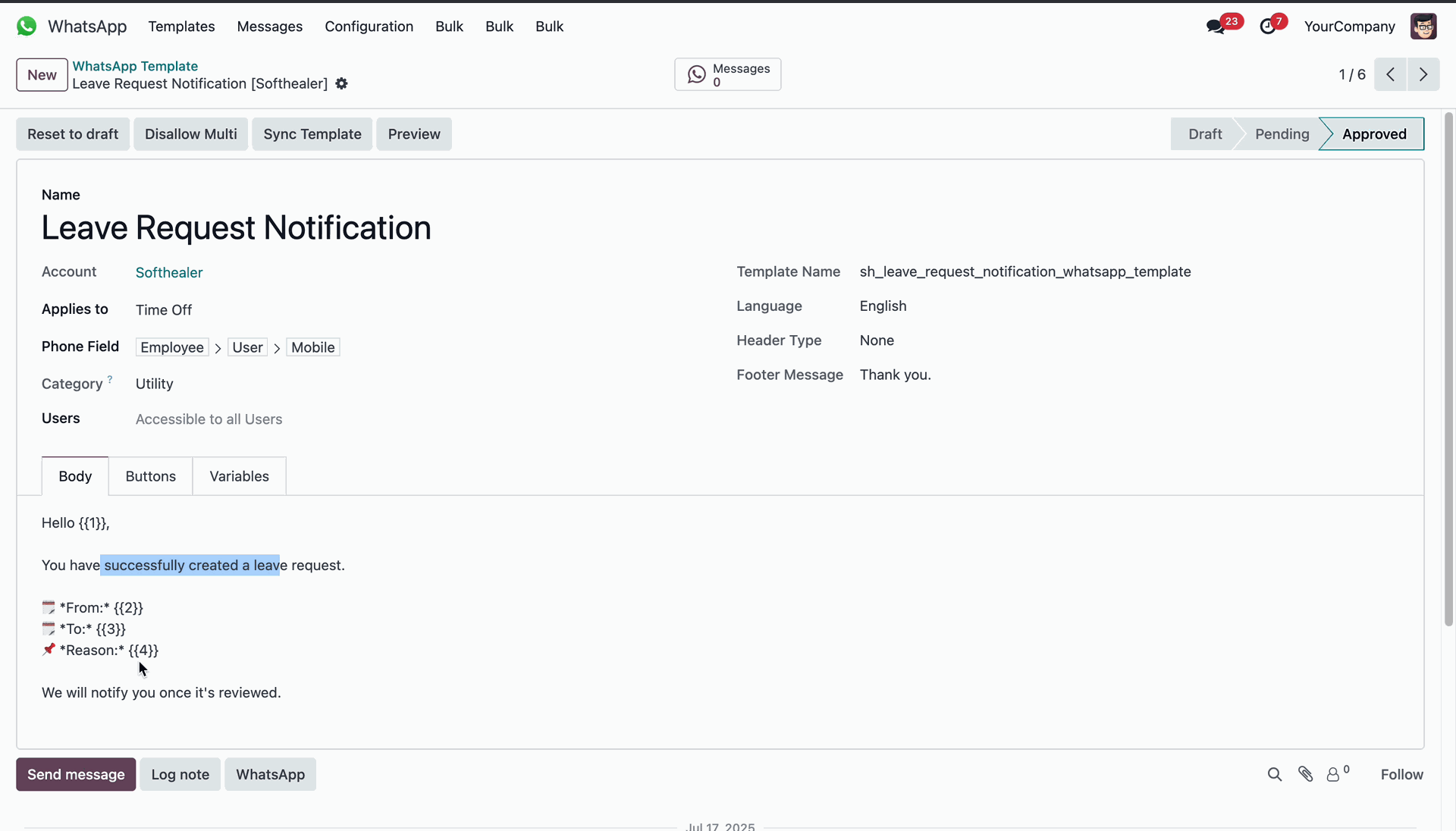 Finalizing the WhatsApp template for approved leave notifications.