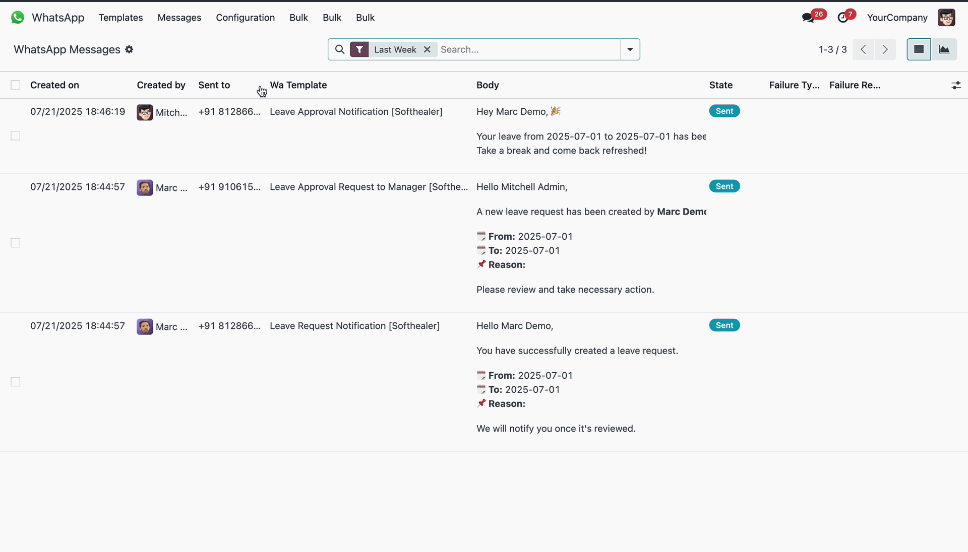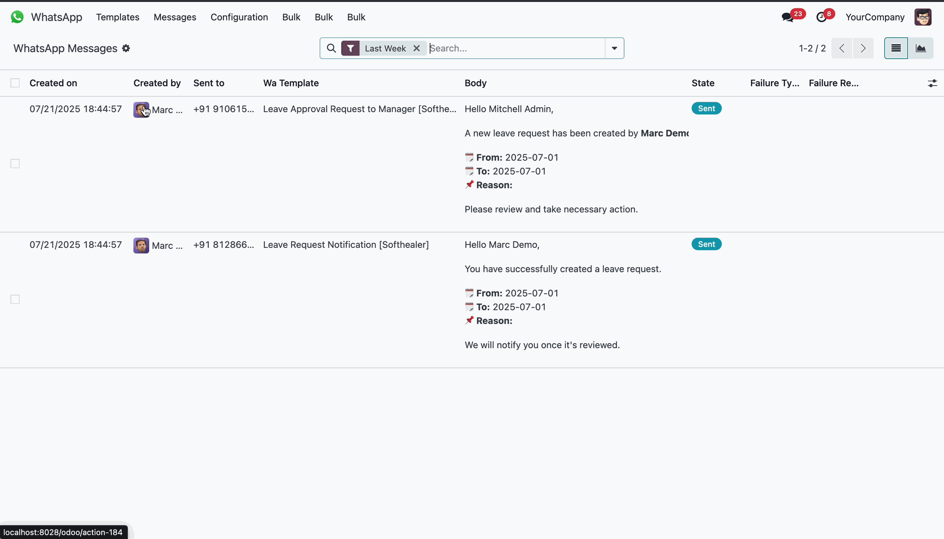 Monitoring sent WhatsApp notifications for leave requests.