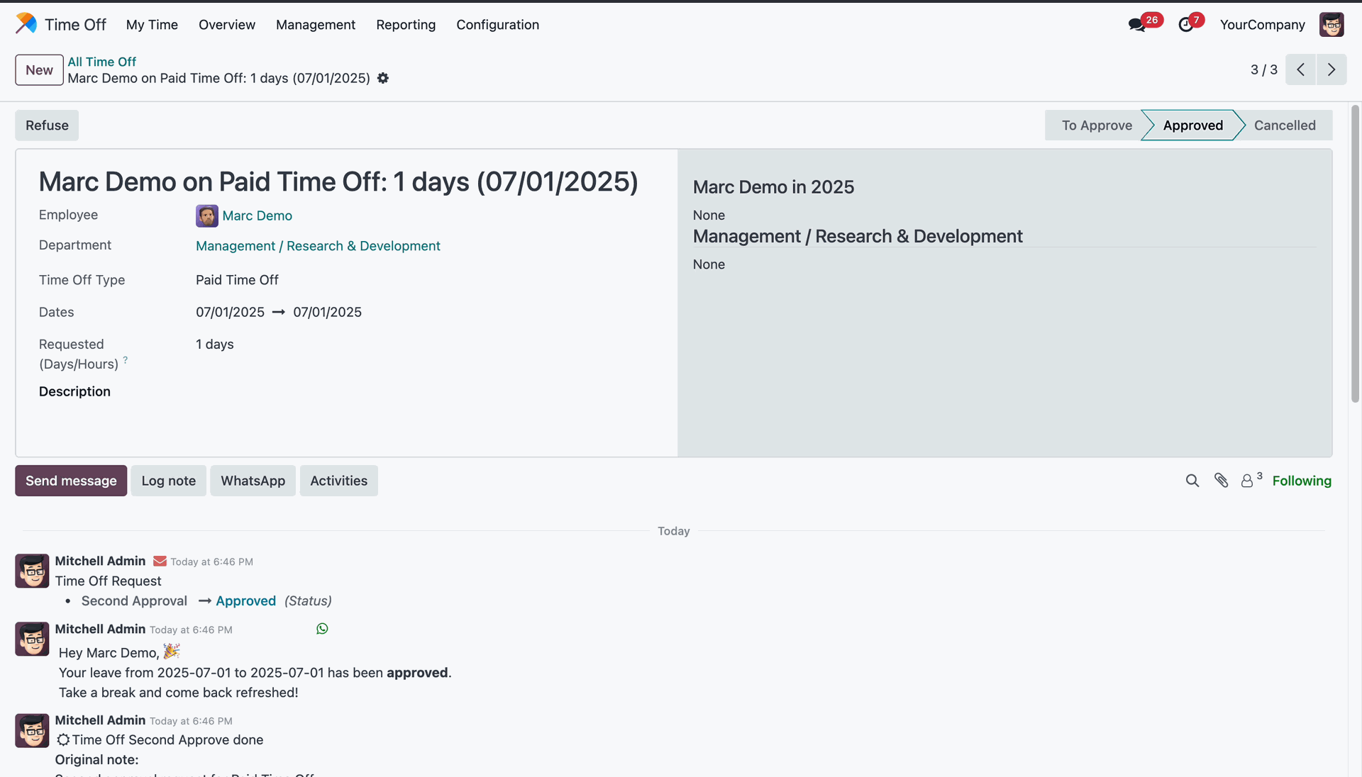Reviewing the finalized approval and automated WhatsApp notification for employee's time off.