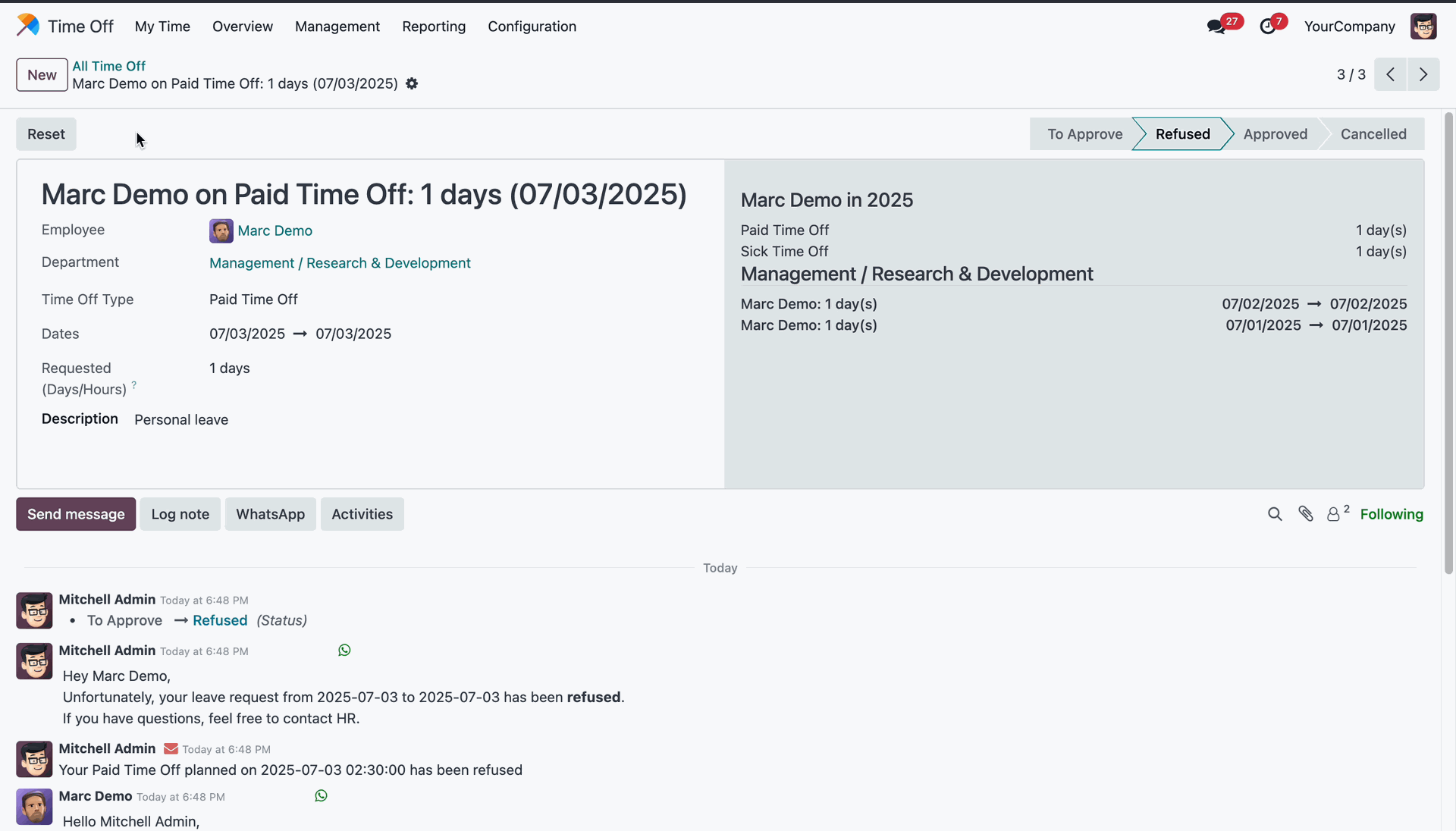Reviewing the "Refused" status and automated rejection notification for employee's leave request.