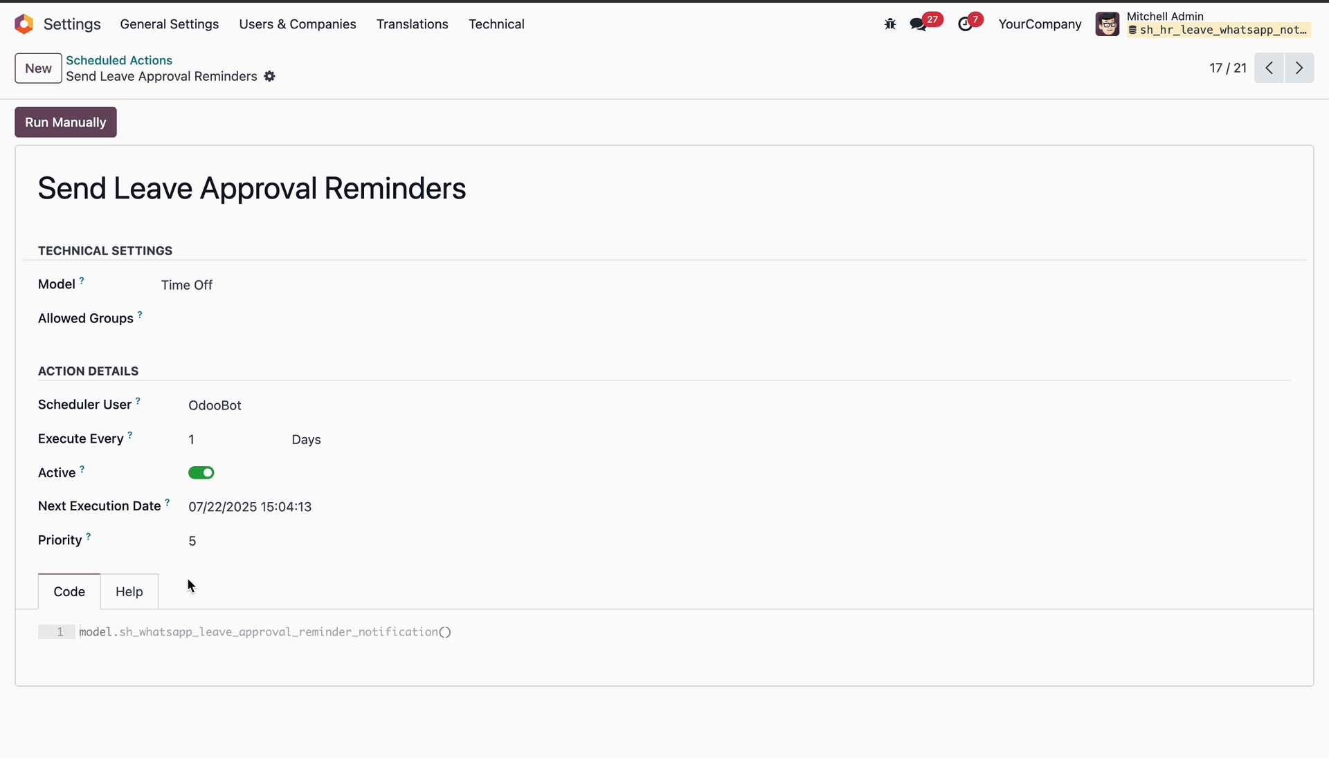 Configuring the WhatsApp reminder for pending leave approvals.