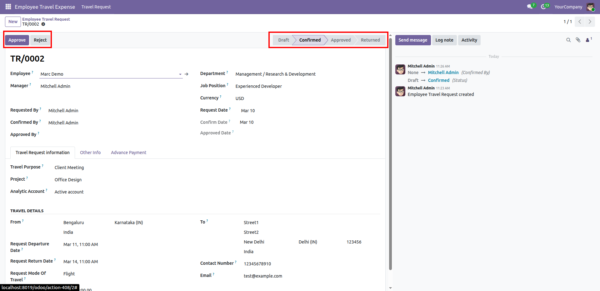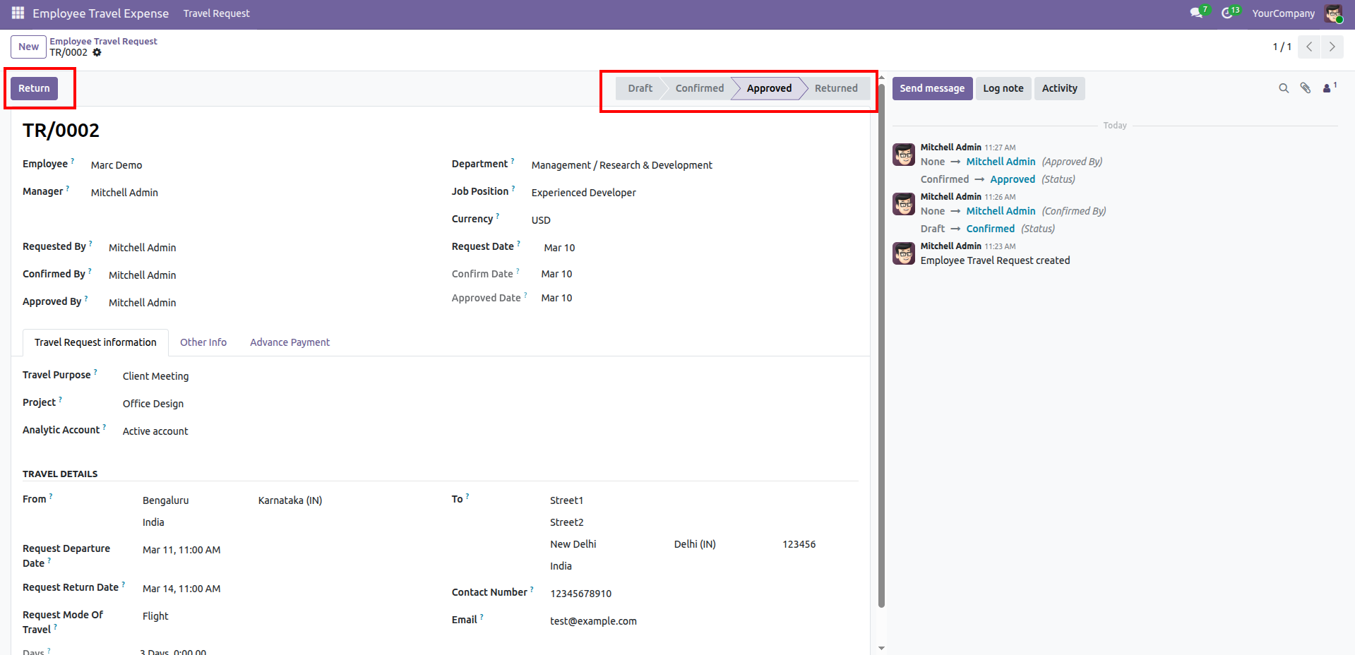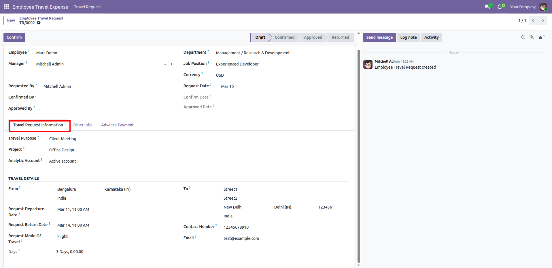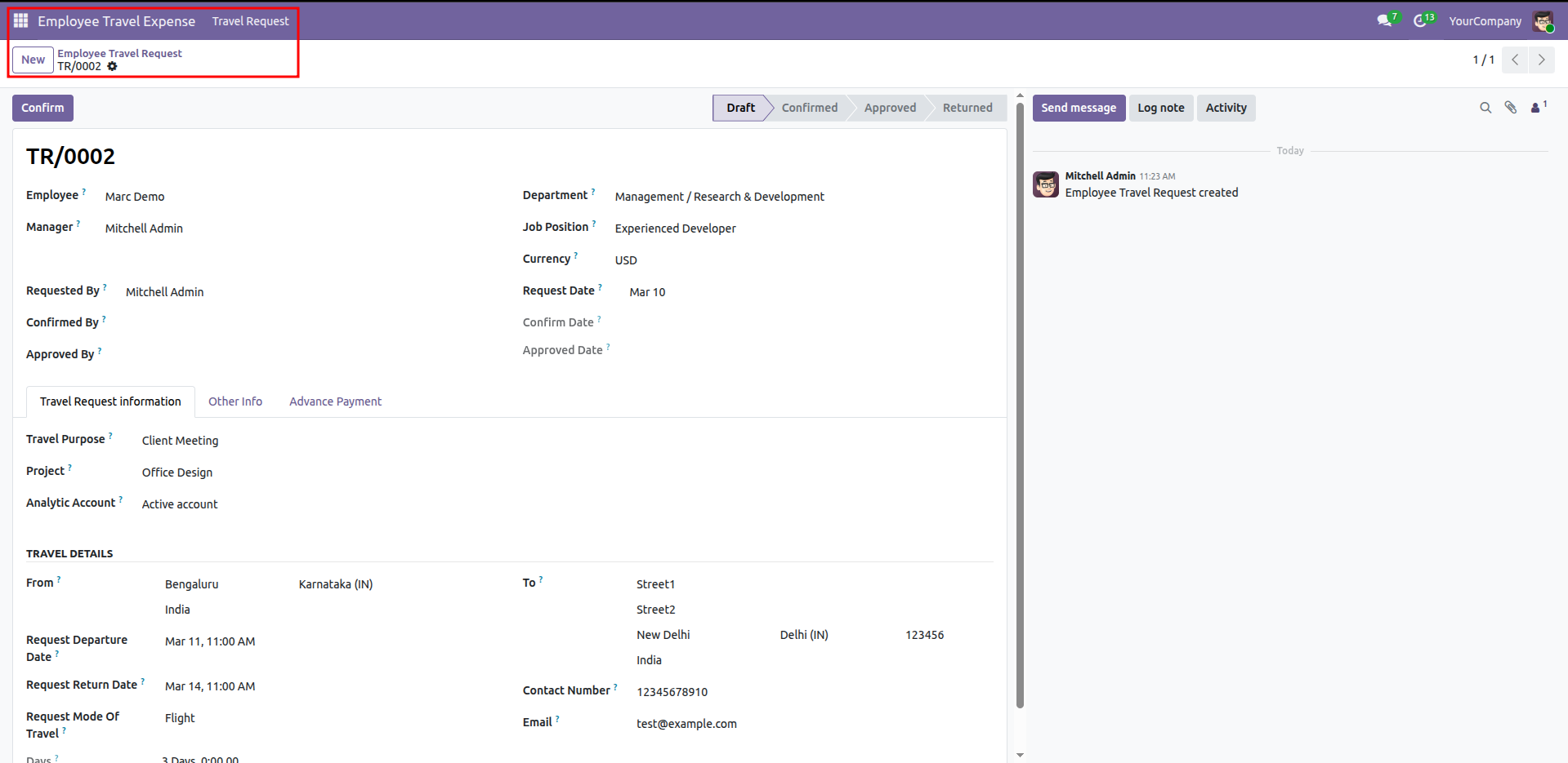The Employee Travel Expense module streamlines the complete travel request and expense process by allowing employees to create detailed travel requests, while managers can review them and approve or reject them. It centralizes all travel-related information, including travel details, additional logistics, and advance payments, ensuring better planning, transparency, and financial control.