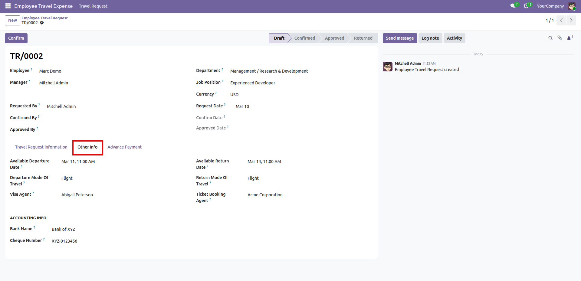 Link travel requests to specific projects and analytic accounts for accurate cost tracking and reporting.