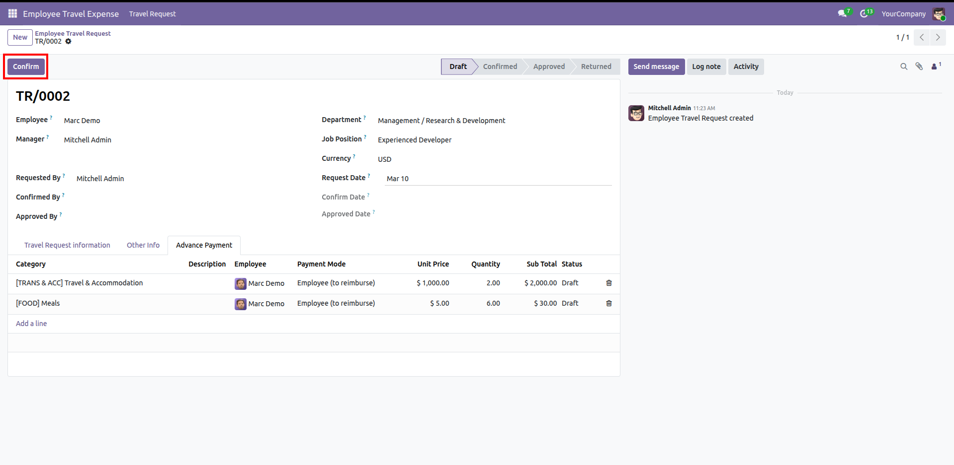 Clicking the "Confirm" button to move the travel request from draft to the next stage of the workflow.