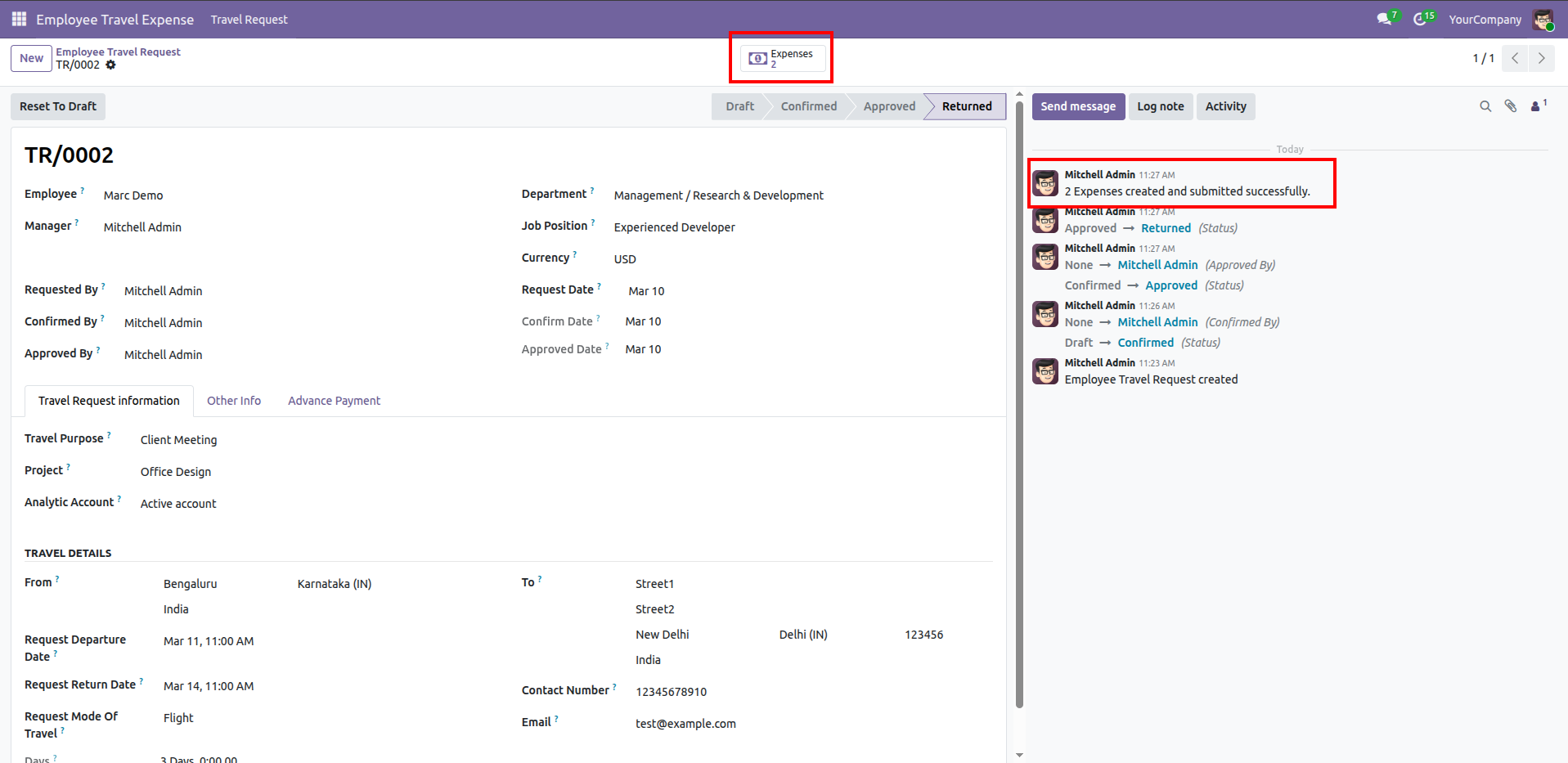 Selecting "Create Expenses" or "Reset To Draft" for a travel request that has been moved to the "Returned" state.