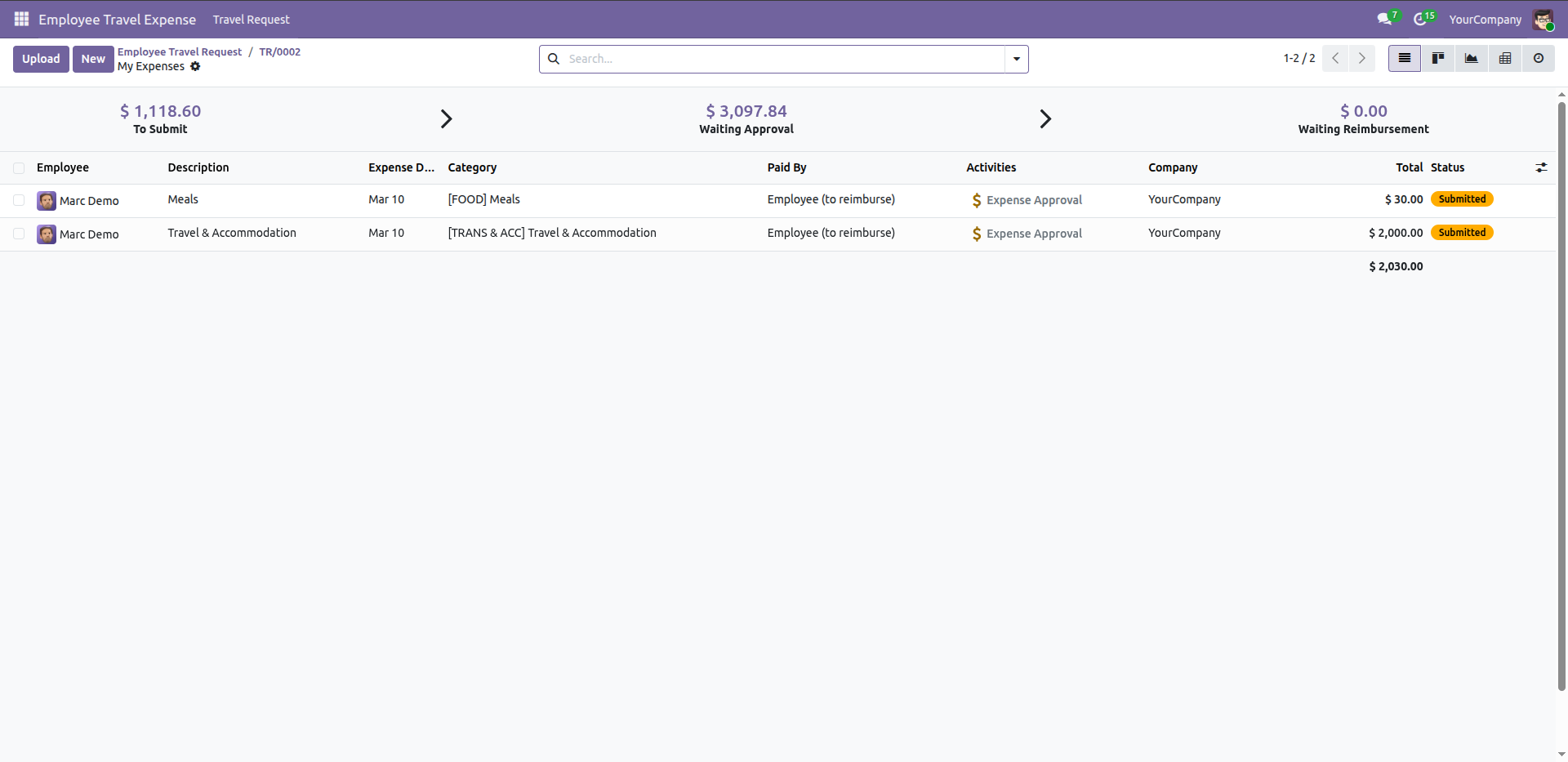 Reviewing submitted expenses for Employee awaiting approval within the Travel Expense module.