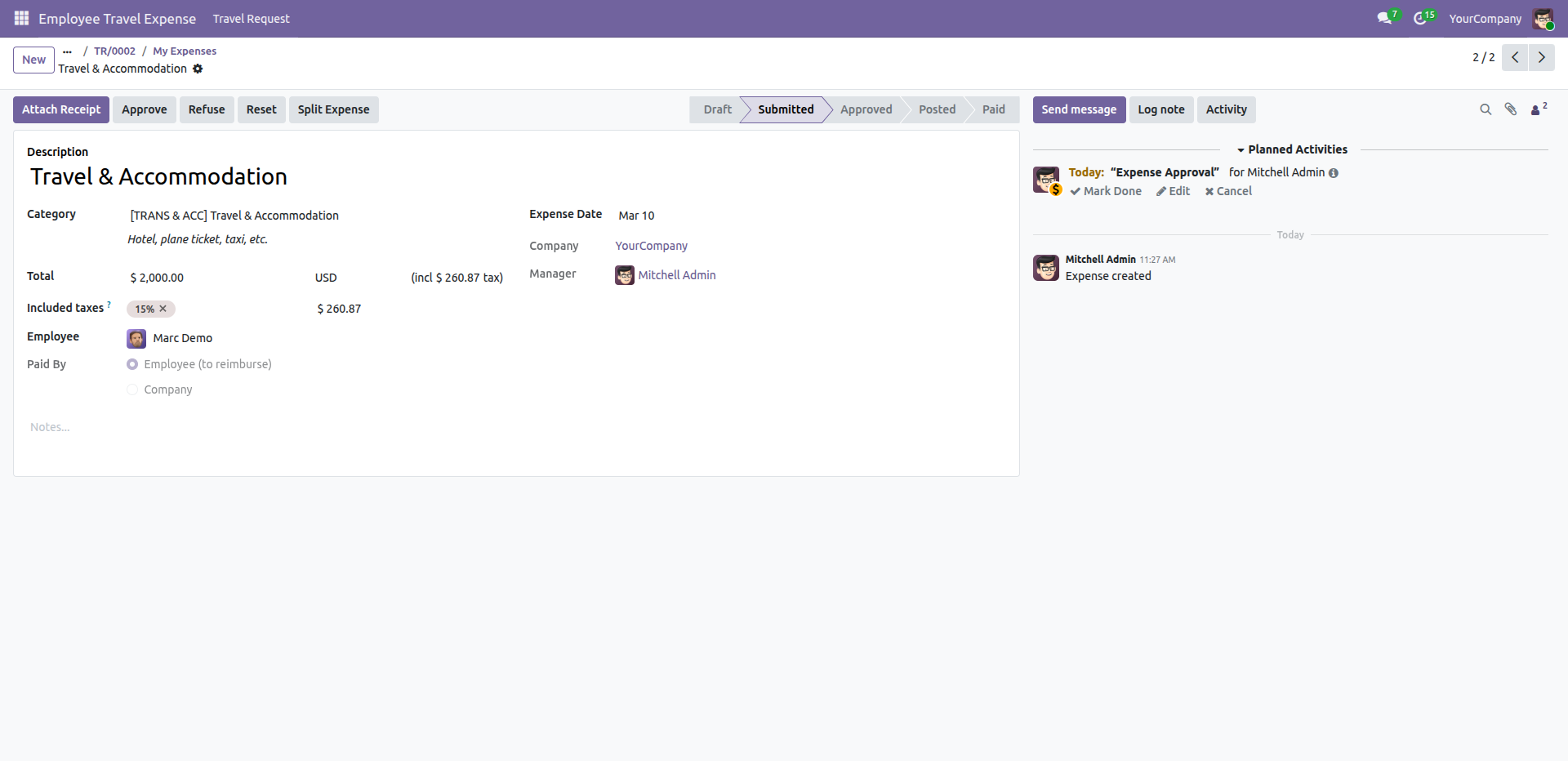 Reviewing a submitted travel and accommodation expense with options to attach a receipt, approve, or split the expense.