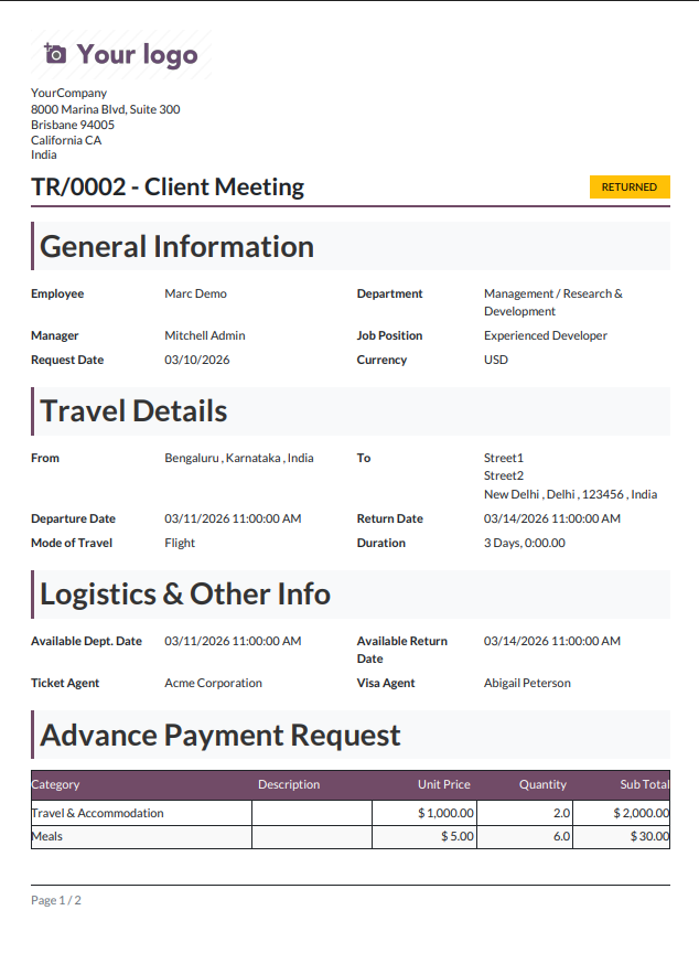 Manage advance payments related to travel directly within the request. Track financial details to ensure proper expense control.