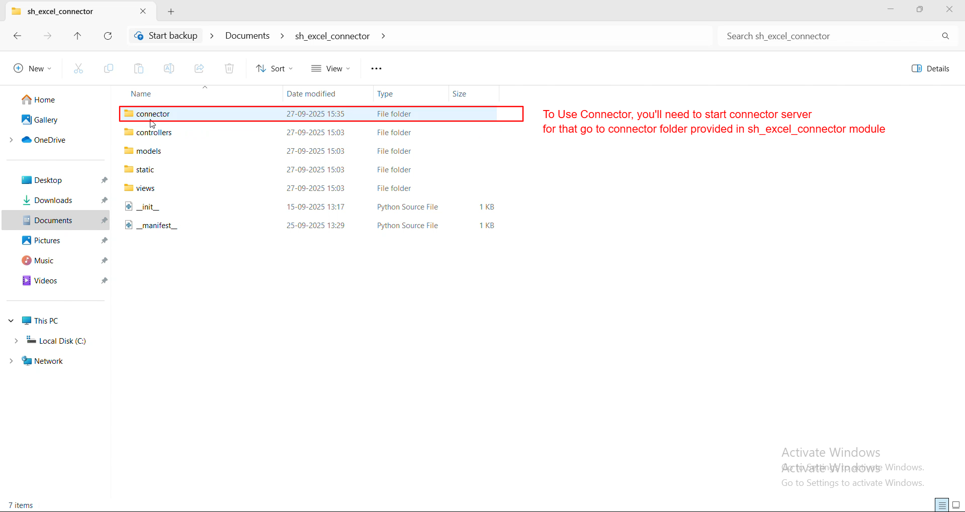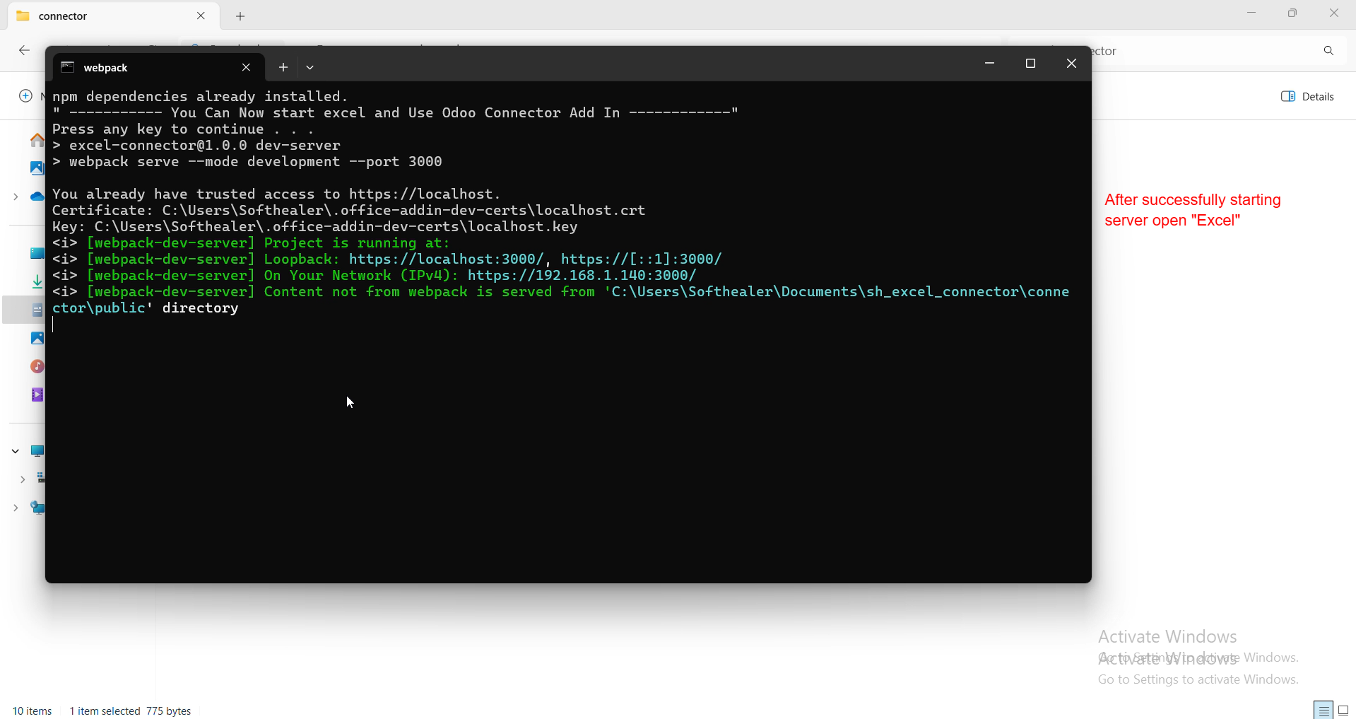 You can start the connector server by opening the connector folder included inside the Excel Odoo module.
