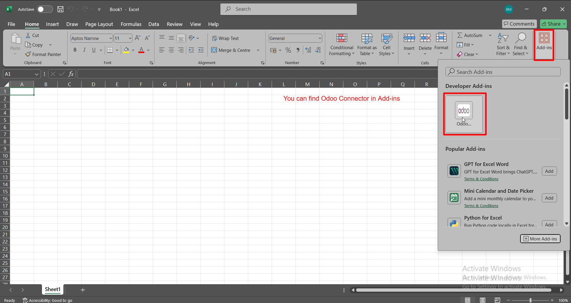 You can open Excel and access the Odoo Connector directly from the Add-ins panel.