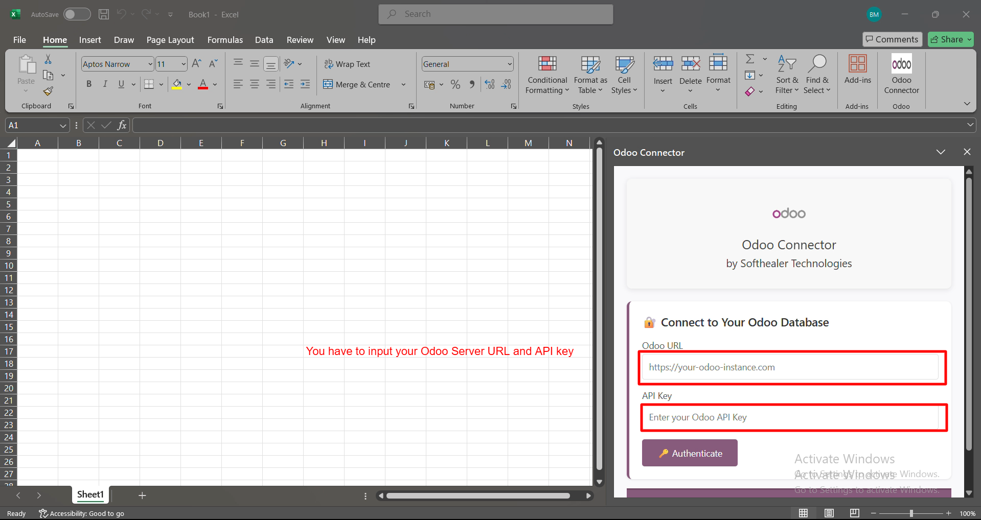 After entering your Odoo URL and API Key, simply click Authenticate to connect your Excel with Odoo.