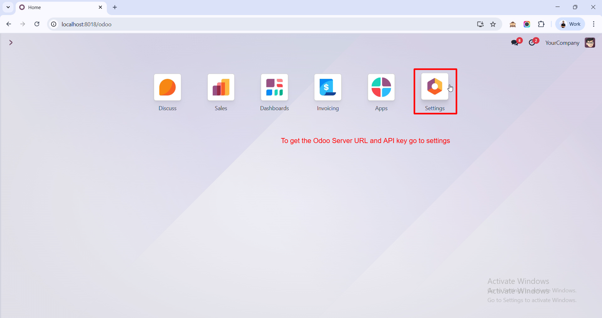 To get your Odoo Server URL and API Key, go to the Settings.