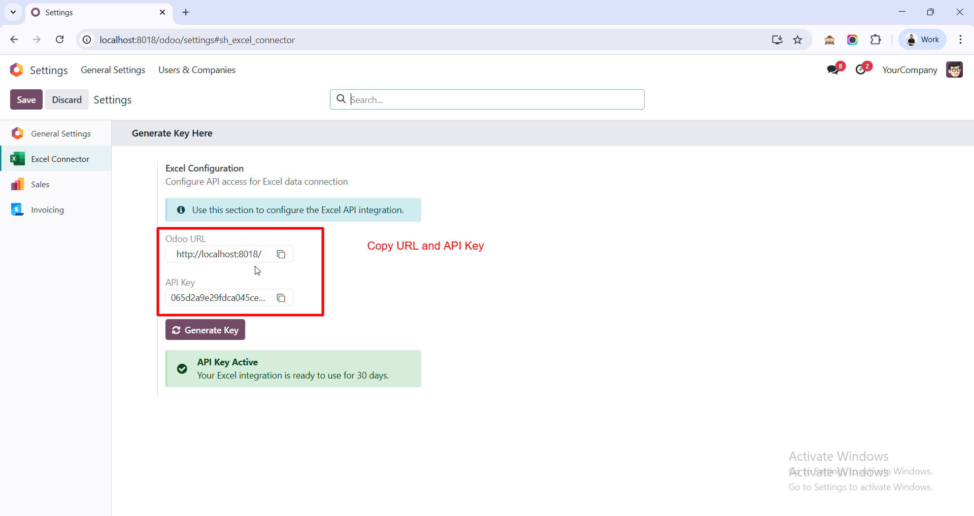 Generate your Odoo URL and API Key using Generate Key, then click Save to apply the configuration.