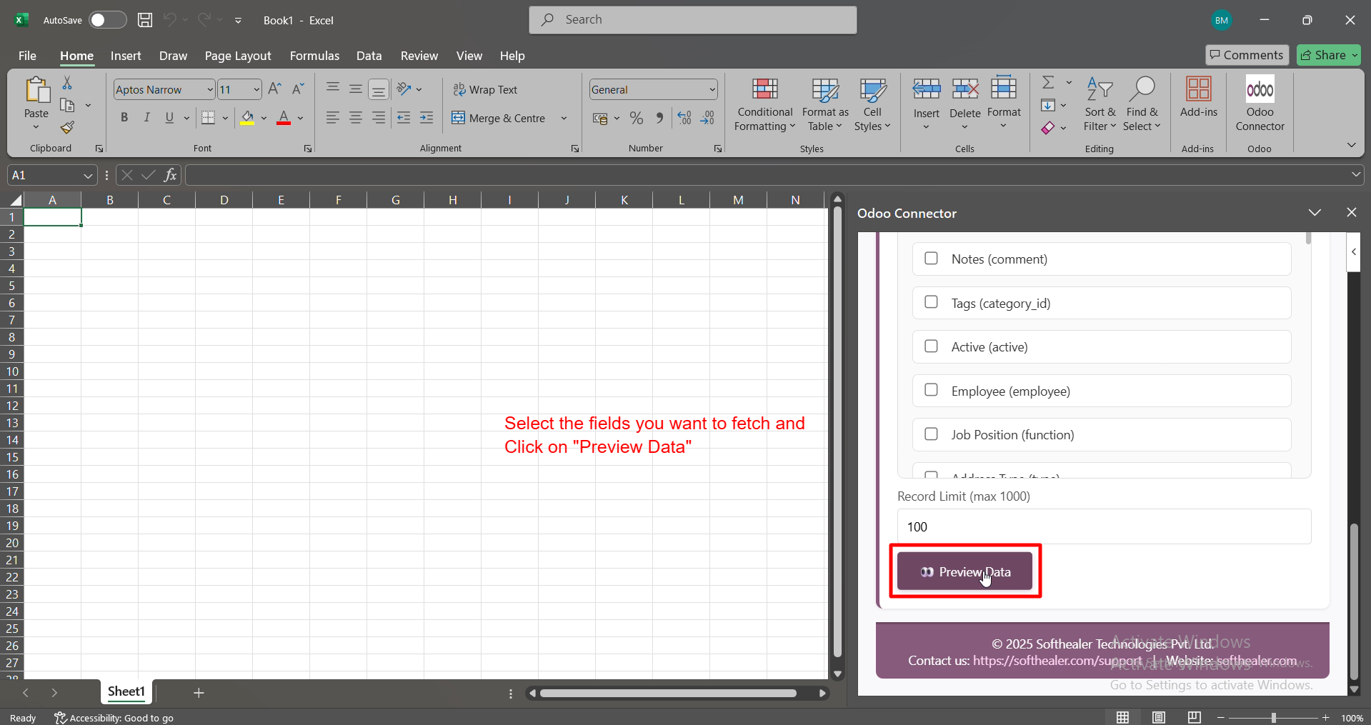 Select the fields you want to fetch and then click Preview Data to instantly see your Odoo records.