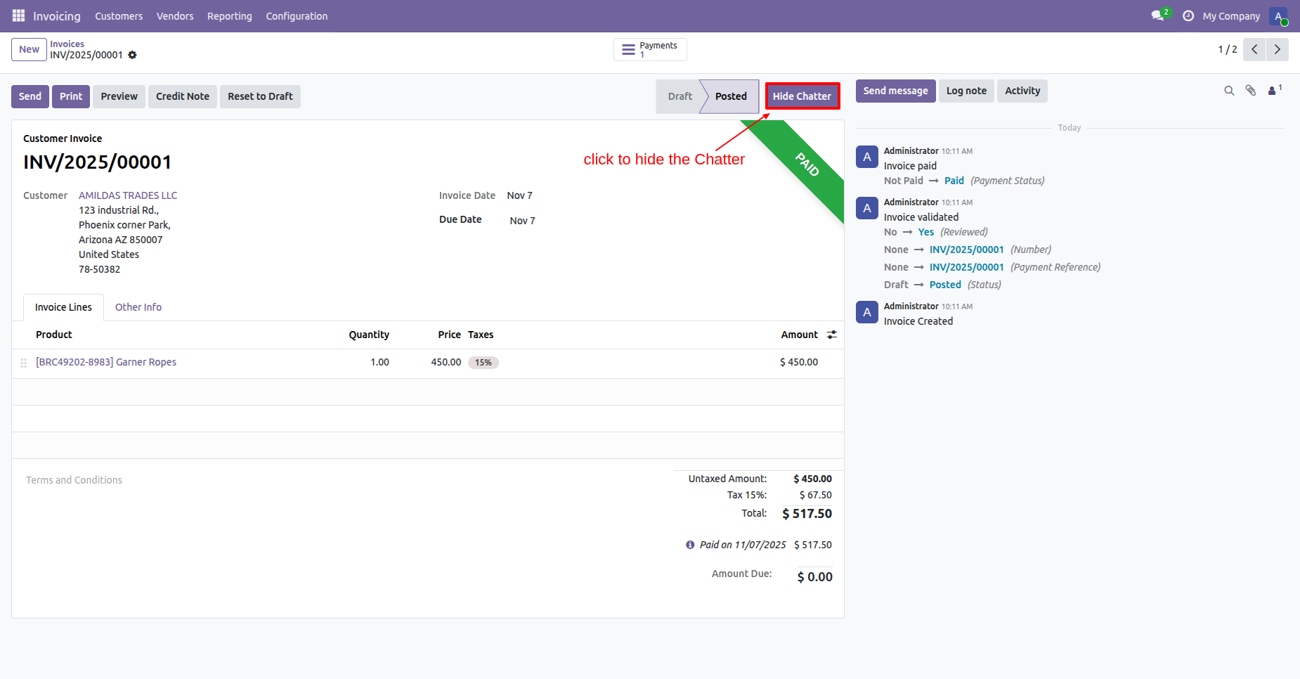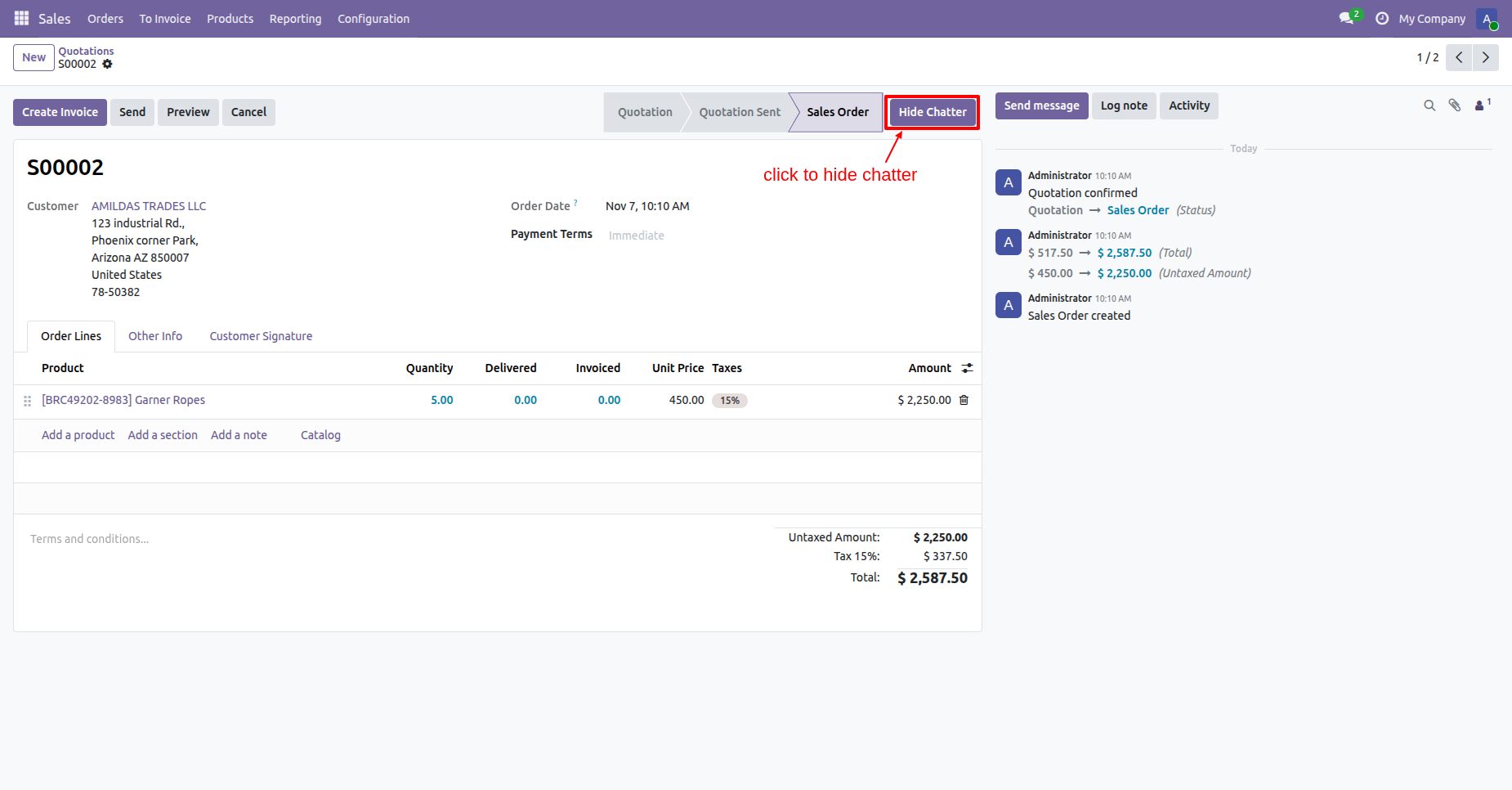 The 'Hide Chatter' button appears in the status bar of the form view. When clicked, the communication history is hidden, and the form expands to occupy the full width of the screen.