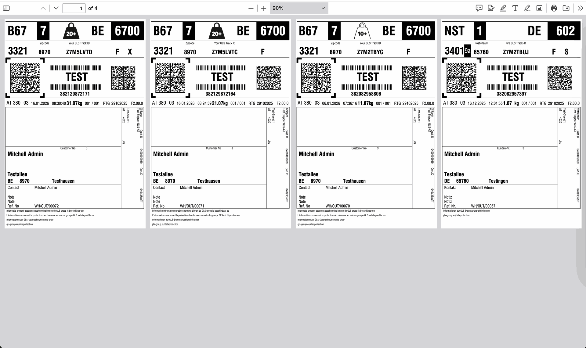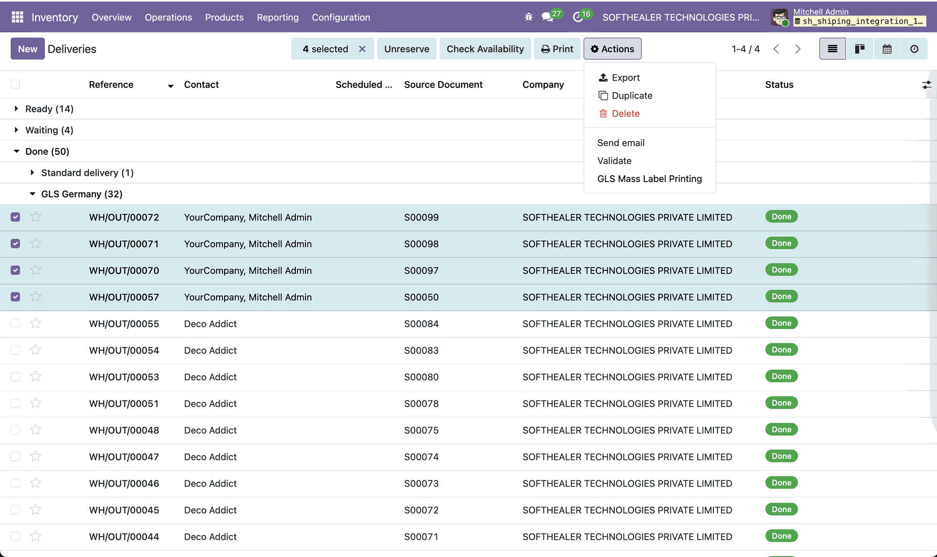 Select deliveries and click Action -> GLS Mass Label Printing.