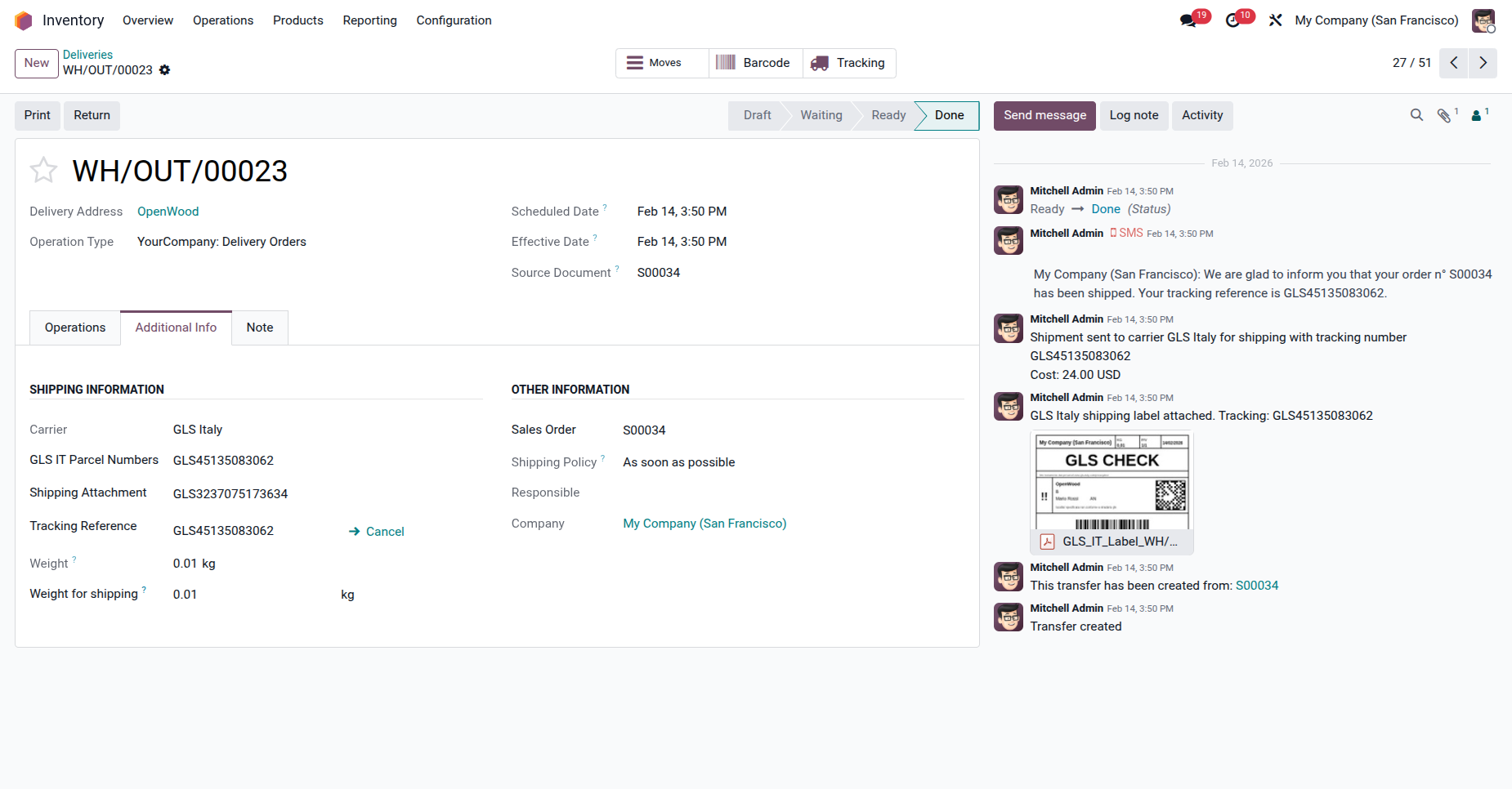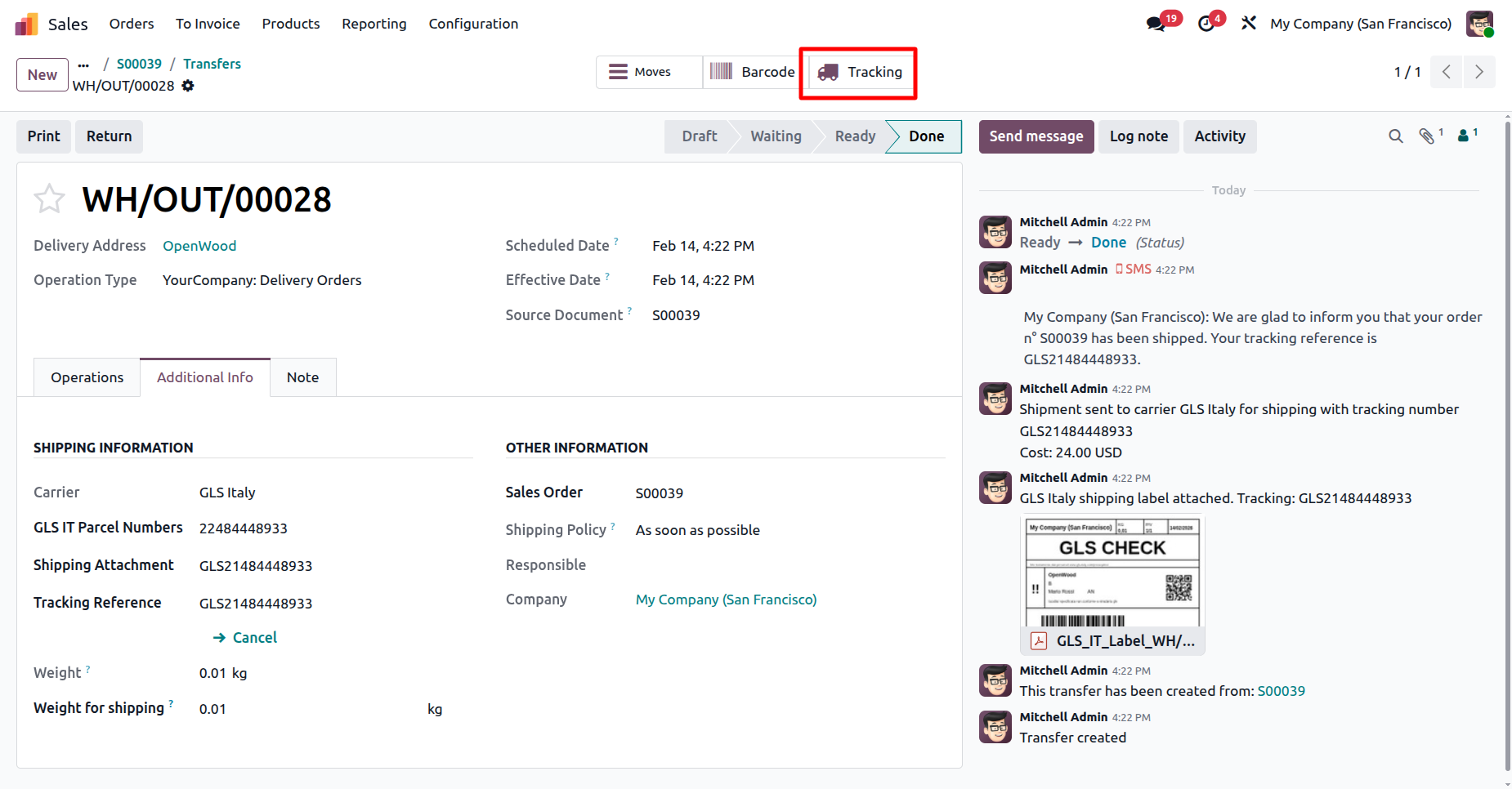 The delivery order with details in the backend. It displays the Shipping Information under the Additional Info tab after generating the label. In the log note, it shows that the shipping label was successfully generated, along with a downloadable PDF link.