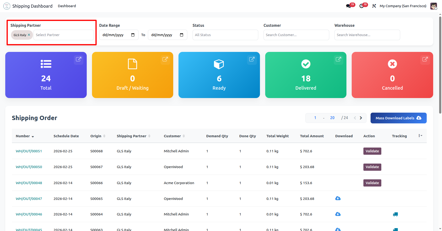 Filter the Shipping Dashboard by a specific Shipping Partner, such as GLS Italy, to instantly isolate and review that shipping partner's open orders and delivery metrics.