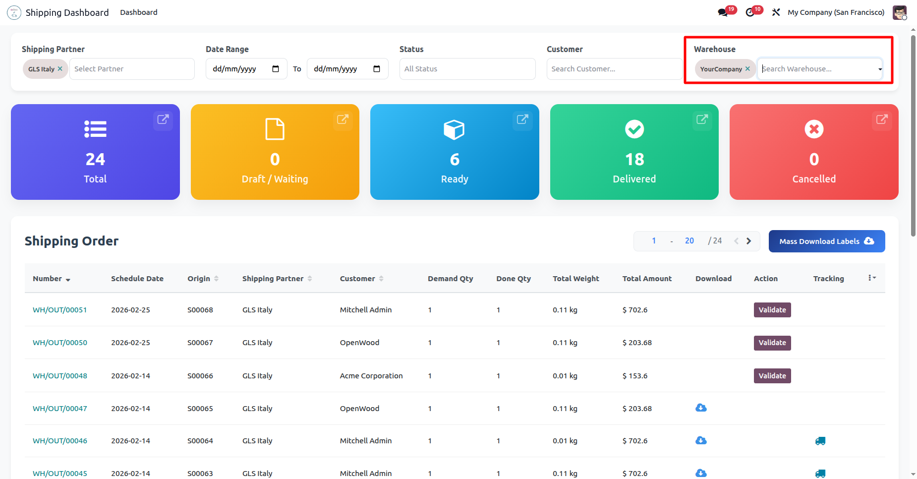 Apply the highlighted Warehouse filter to isolate your view, displaying only the shipments that originate from a specific facility, such as 'YourCompany'.