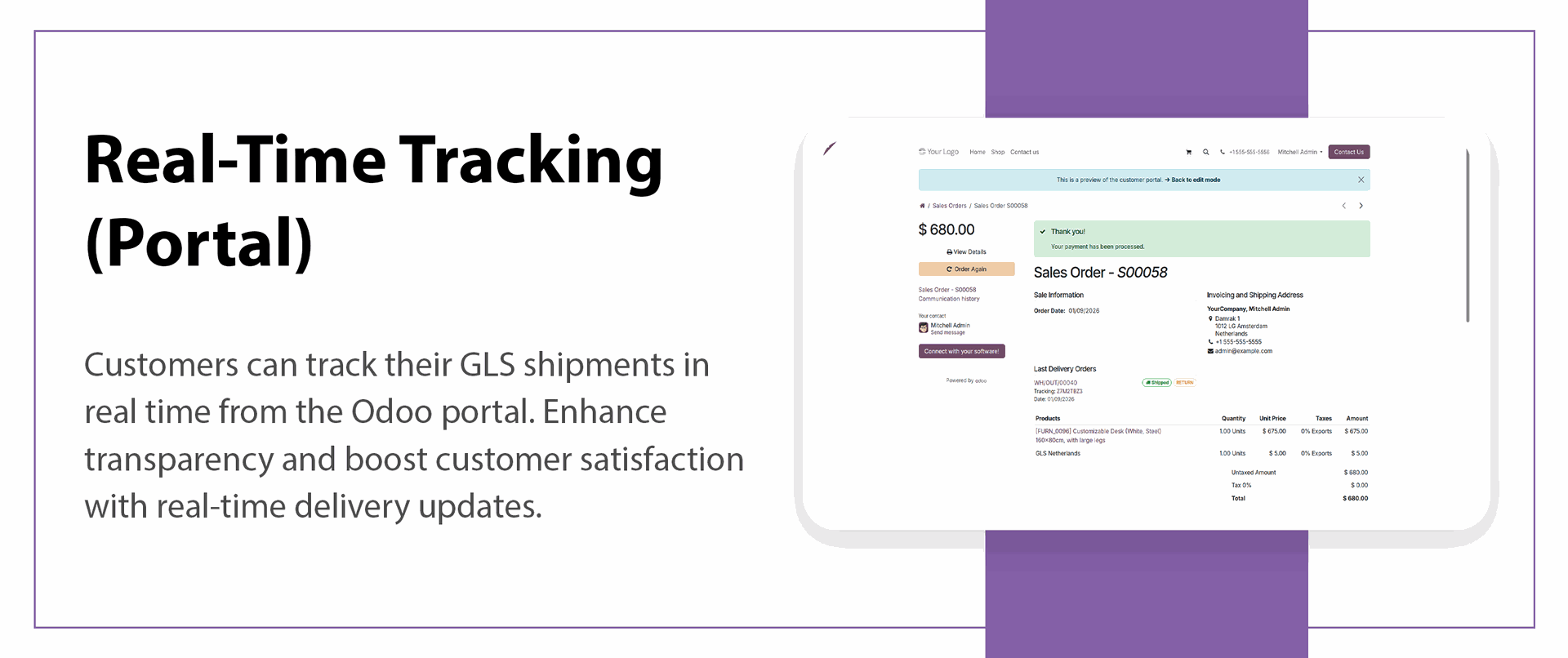 Track shipments in real-time within Odoo - admins can monitor deliveries from the backend, while customers can track from the portal.