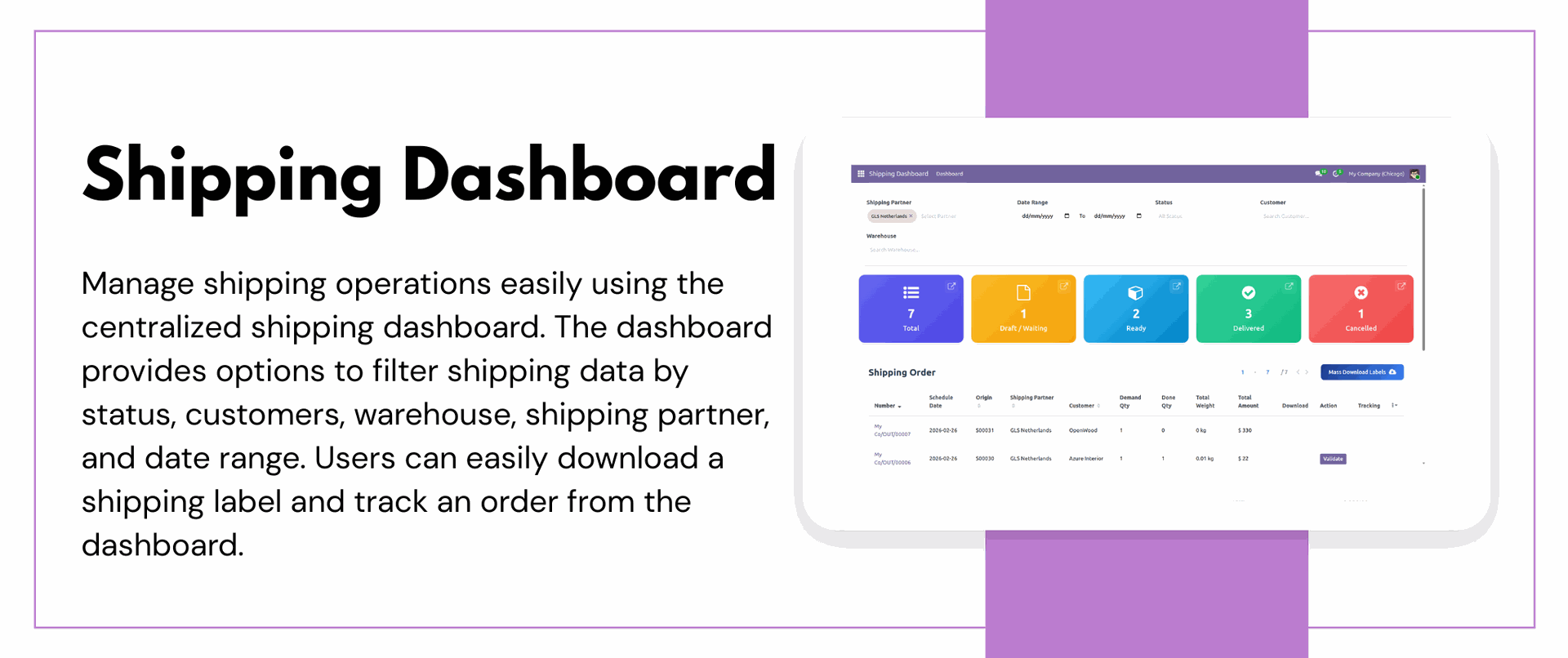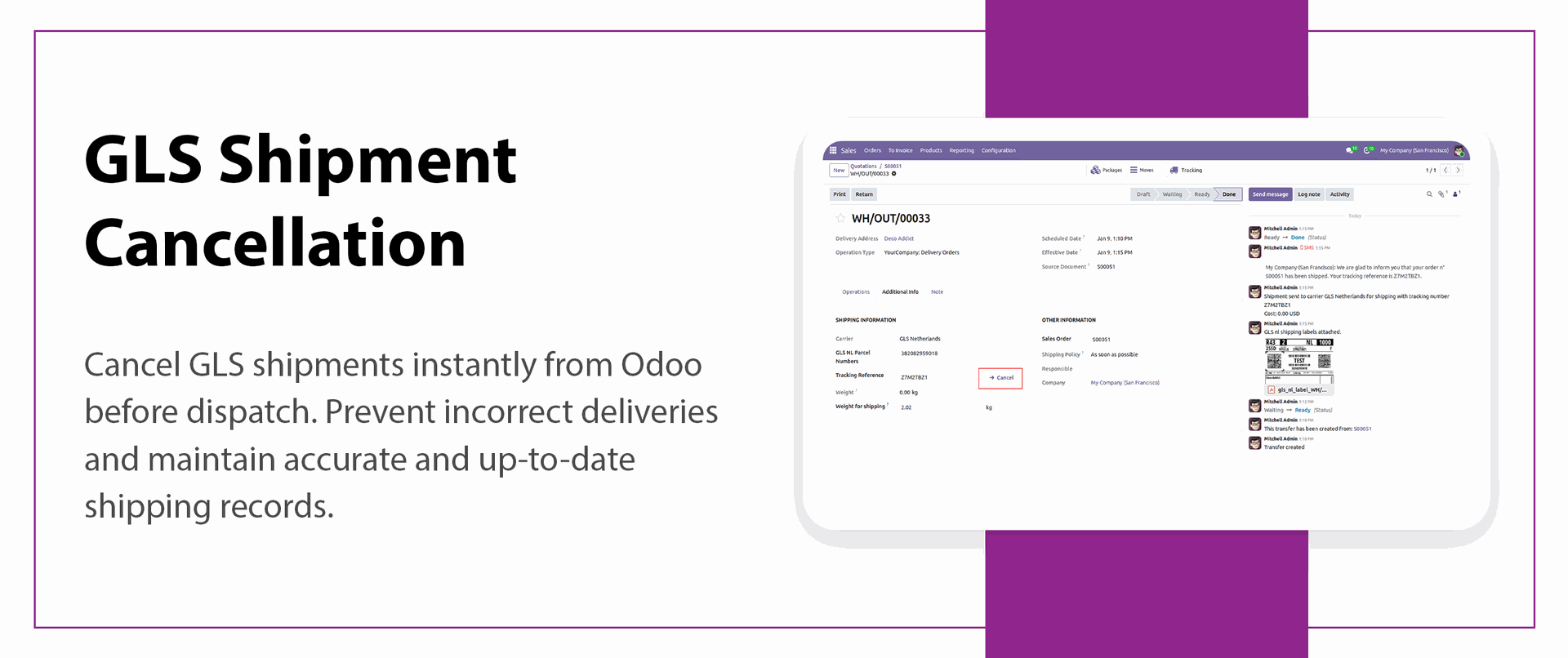 Cancel shipments instantly from Odoo to avoid incorrect deliveries and maintain accurate shipping records.