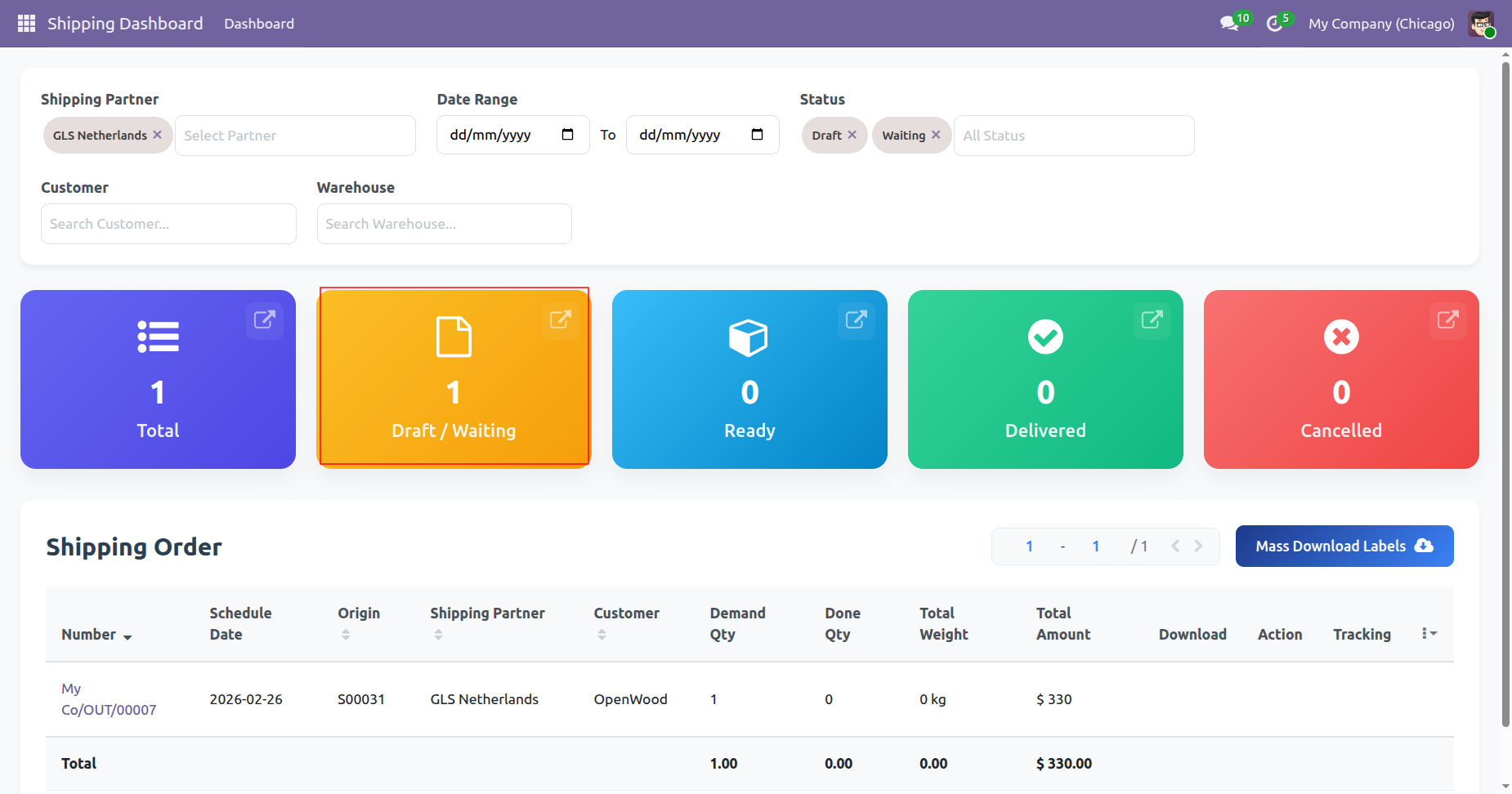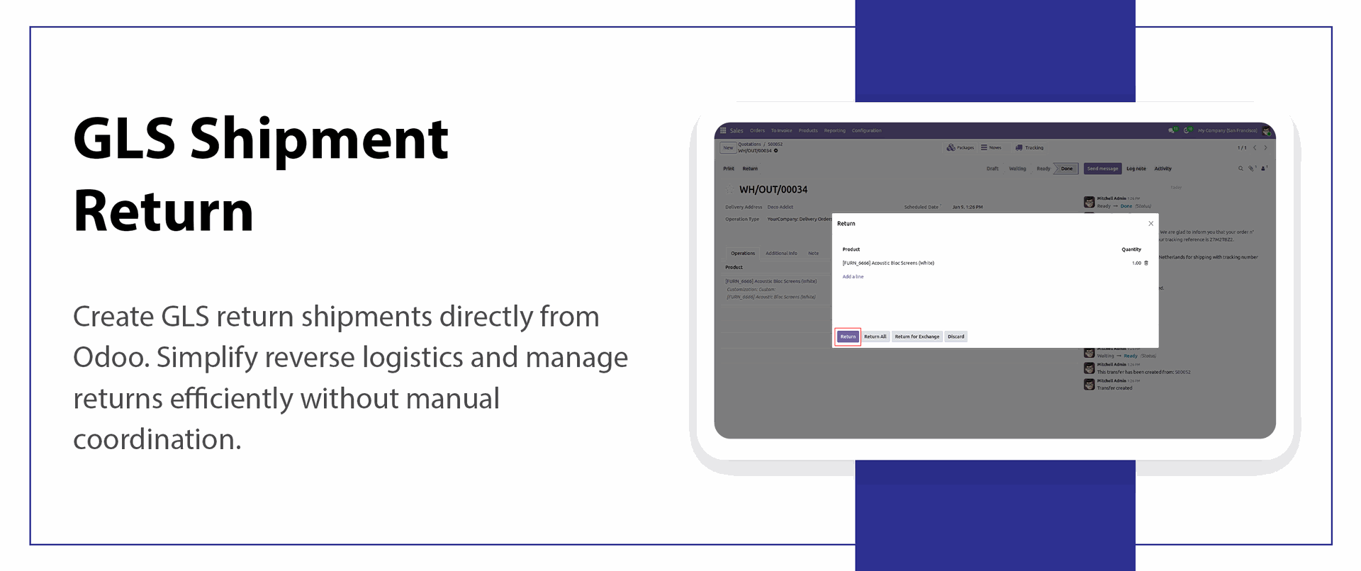 Create and process return shipments directly from Odoo with a single click to ensure smooth and hassle-free reverse logistics.