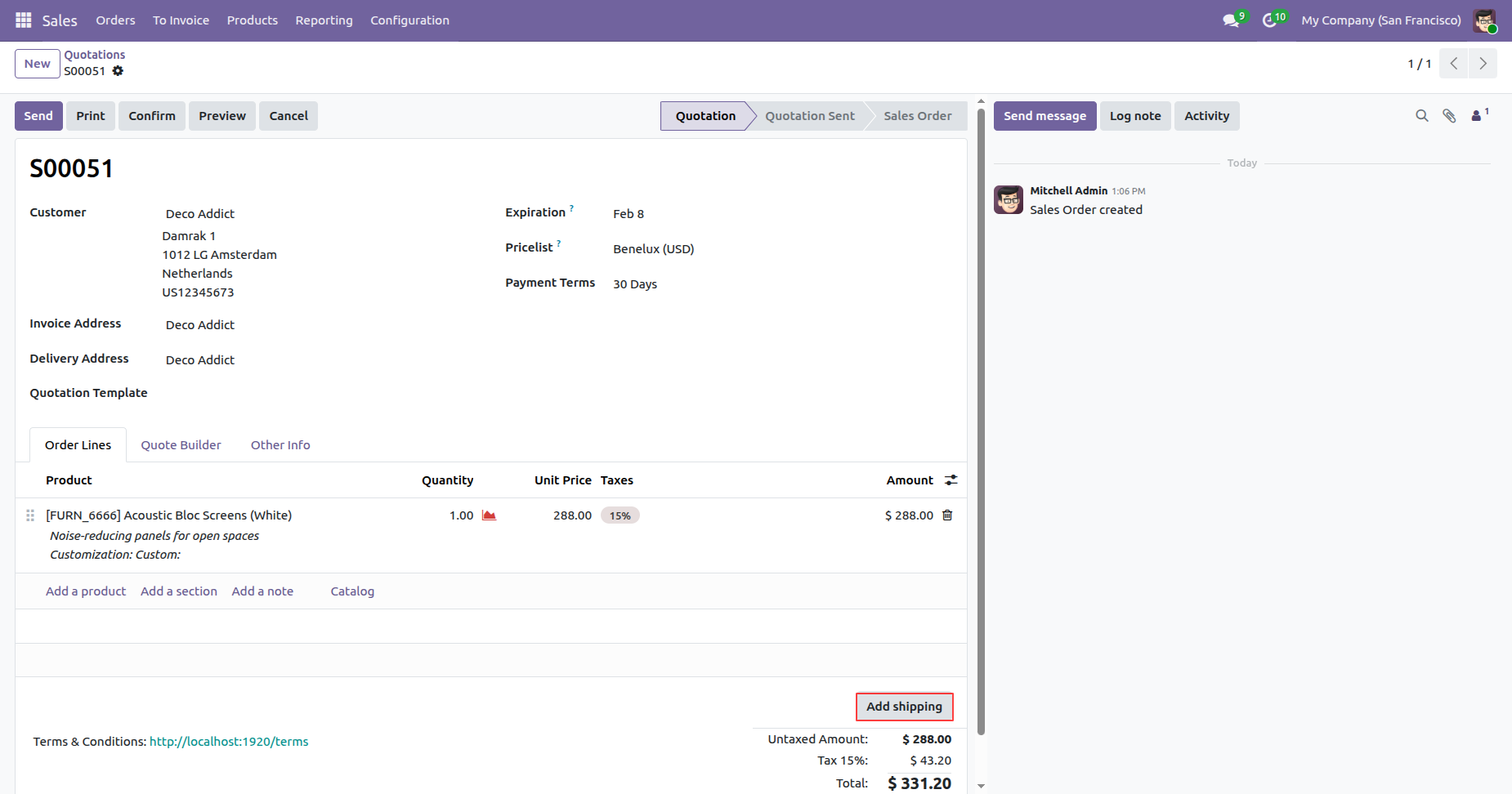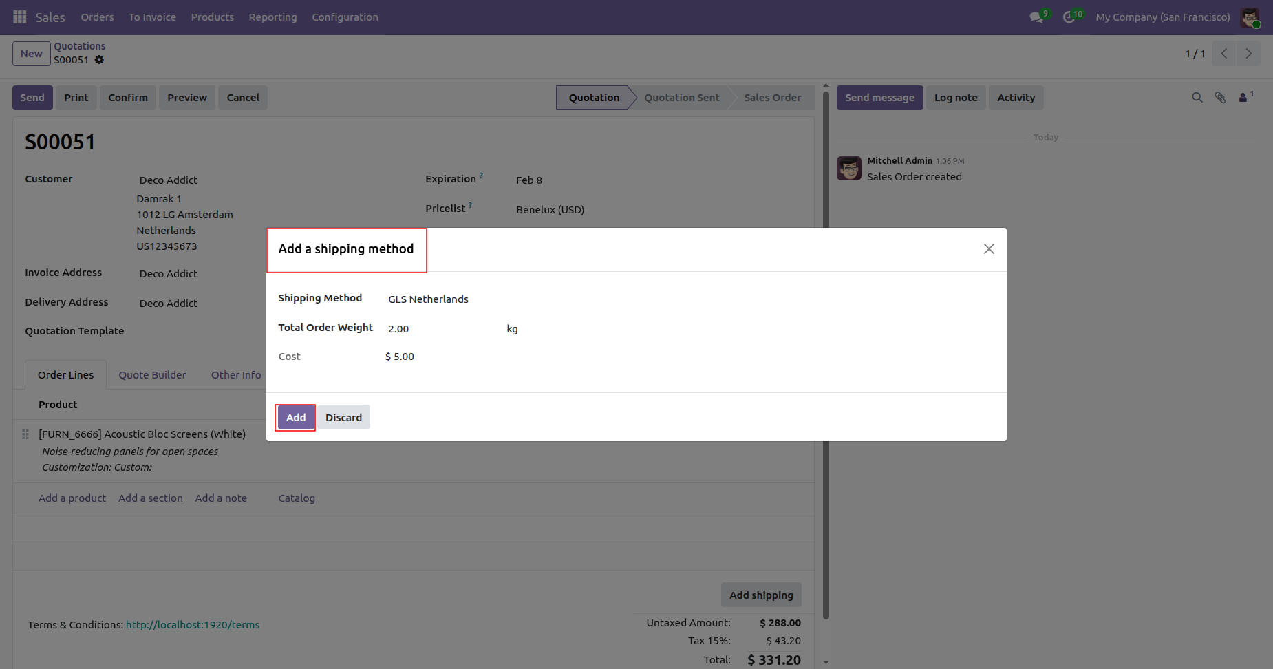 Create a quotation and click on the 'Add Shipping' button.