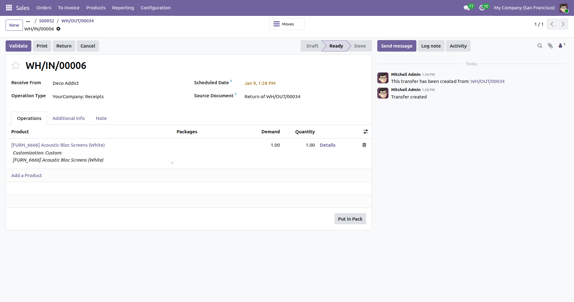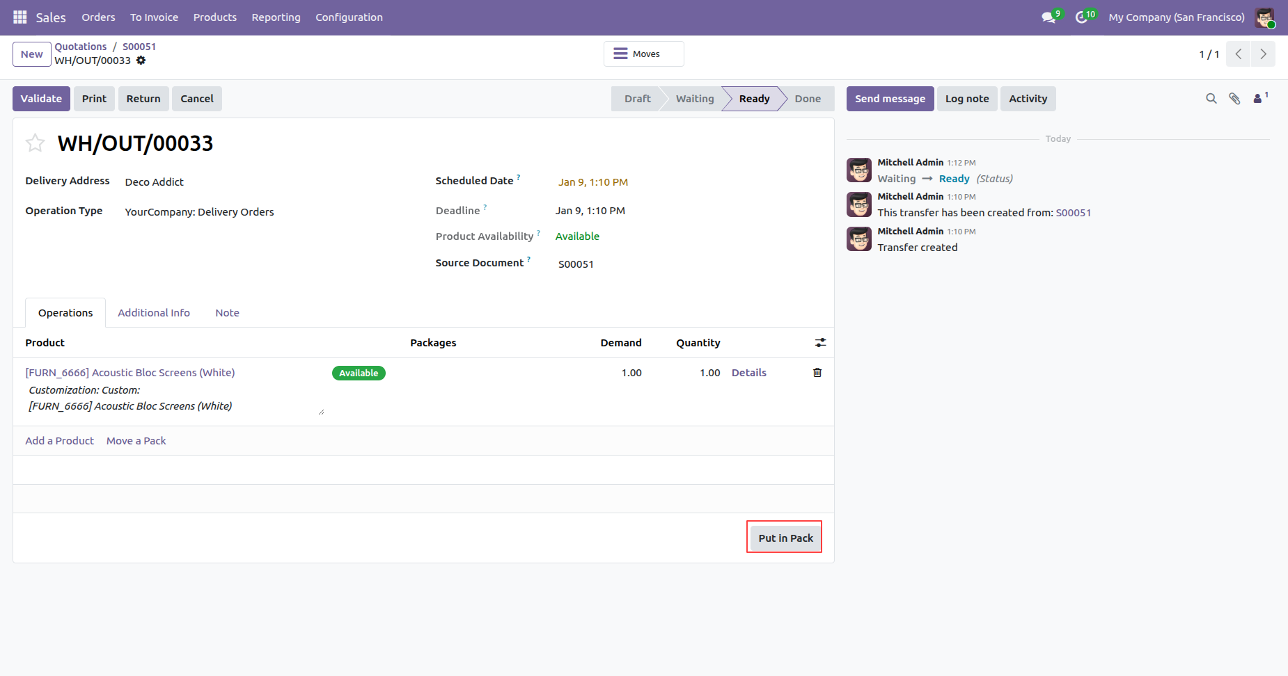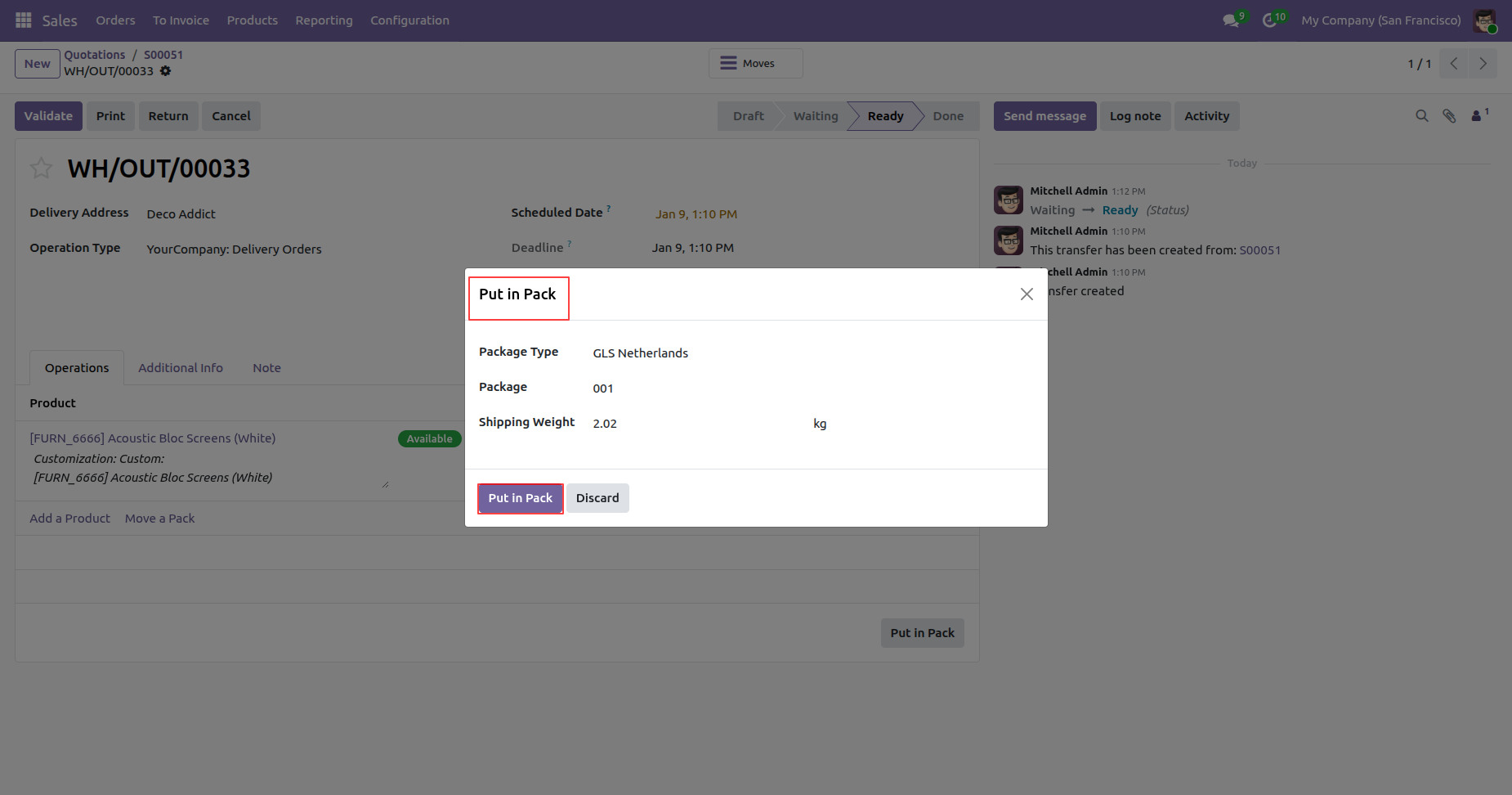 Form view the delivery order, click on the 'Put In Pack' button.